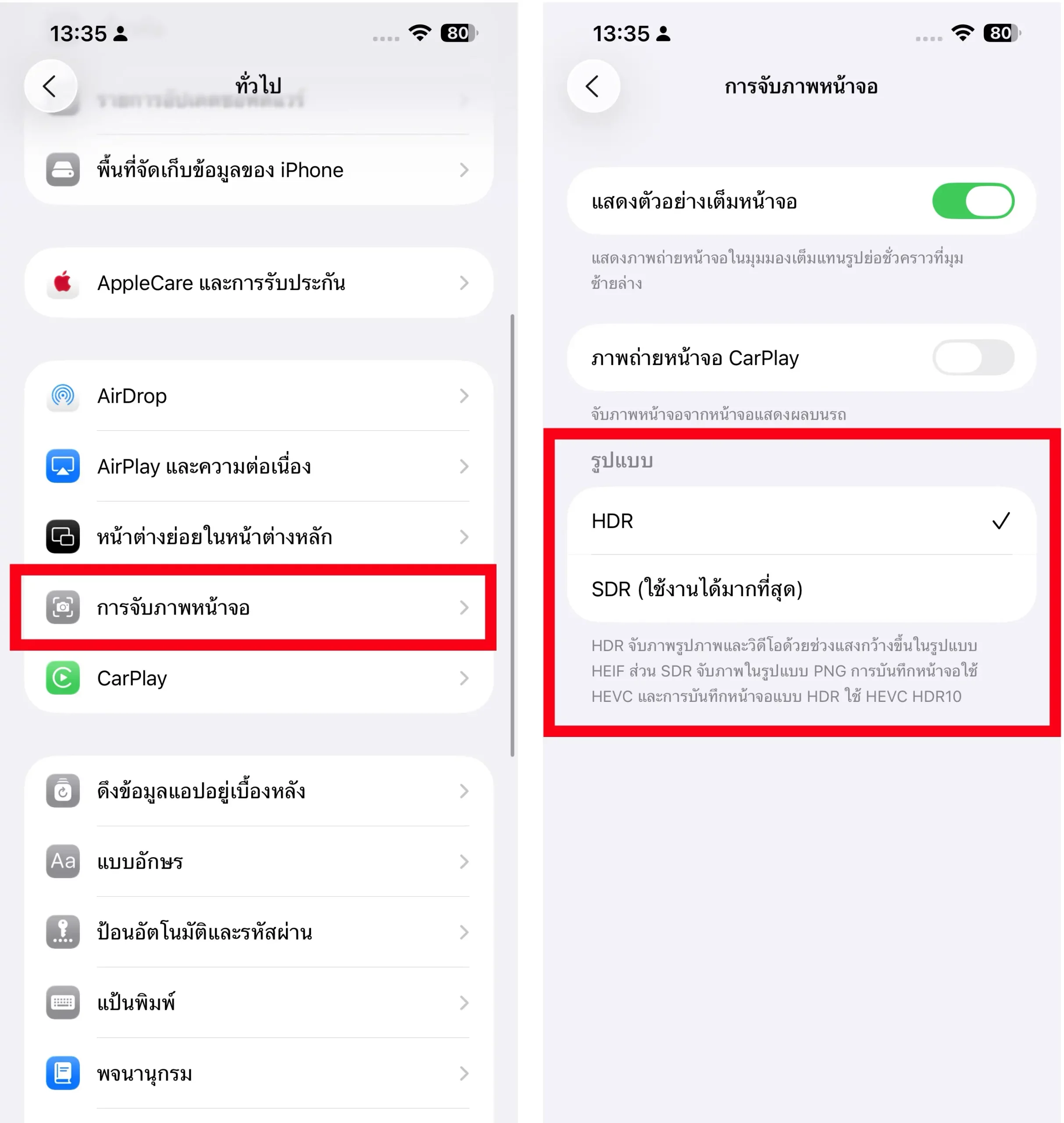 - รูปแบบ: มีให้เลือก HDR กับ SDR, โดย HDR จะแคปภาพเป็นไฟล์ HEIF | HEVC HDR10 ส่วน SDR จะแคปเป็น PNG ใช้งานได้ทั่วไป