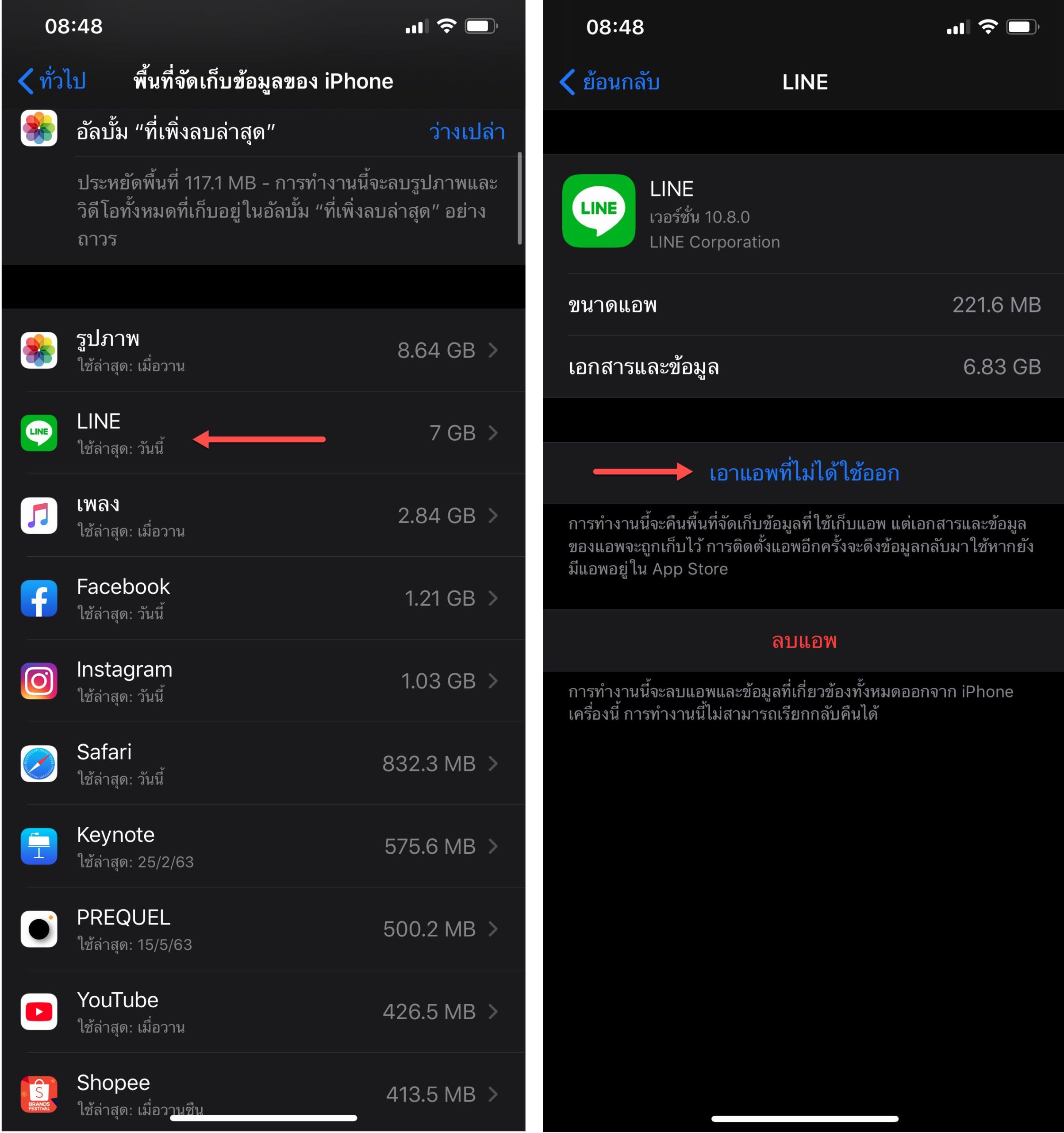 โดยไปที่ การตั้งค่า > ทั่วไป > พื้นที่จัดเก็บข้อมูลของ iPhone > เลือกแอปที่ต้องการ > แตะ ‘เอาแอพที่ไม่ได้ใช้ออก’