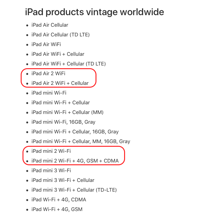 Apple ได้เพิ่มชื่อ iPad Air 2, iPad mini 2 เป็นผลิตภัณฑ์รุ่นเก่า (Vintage) แล้ว สามารถนำเครื่องไปซ่อมที่ศูนย์บริการได้หากที่ศูนย์ซ่อมยังมีอะไหล่เหลืออยู่