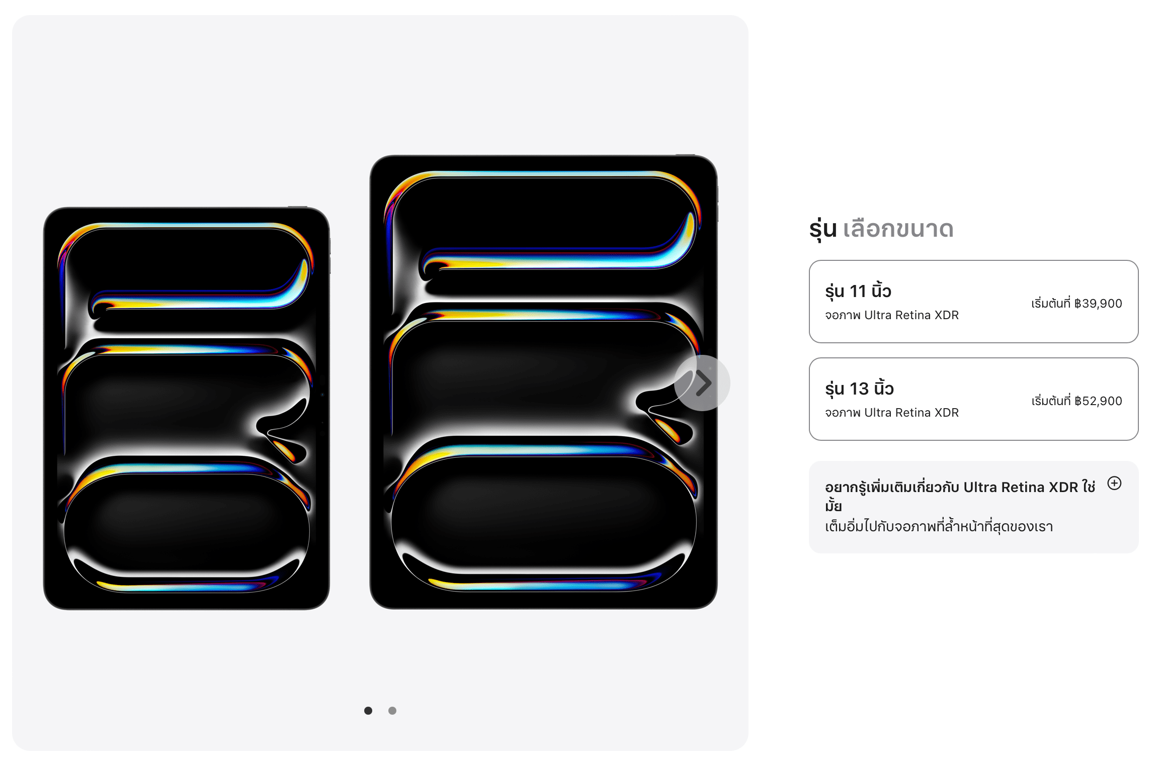 - iPad Pro ชิป M4 รุ่นความจุ 256GB, 512GB จะมาพร้อมชิป M4 CPU 9-core, GPU 10-core ส่วนรุ่นความจุ 1TB, 2TB จะมาพร้อมชิป M4 CPU 10-core, GPU 10-core