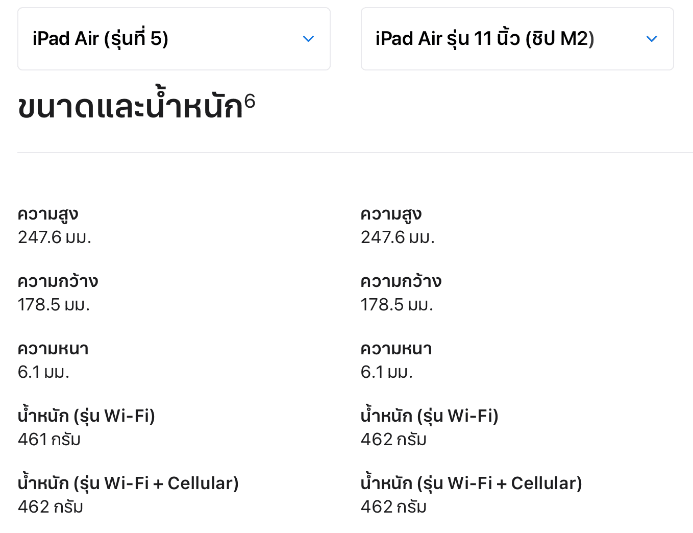 ในสเปคระบุว่าขนาดตัวเครื่องของ iPad Air (รุ่นที่ 6) ชิป M2 11″ ตัวเครื่องมีขนาดเท่ากับ iPad Air (รุ่นที่ 5) ชิป M1 10.9″ ดังนั้นหากมีเคสของ iPad Air รุ่นเก่า ก็ยังสามารถนำมาใส่รุ่นใหม่ได้