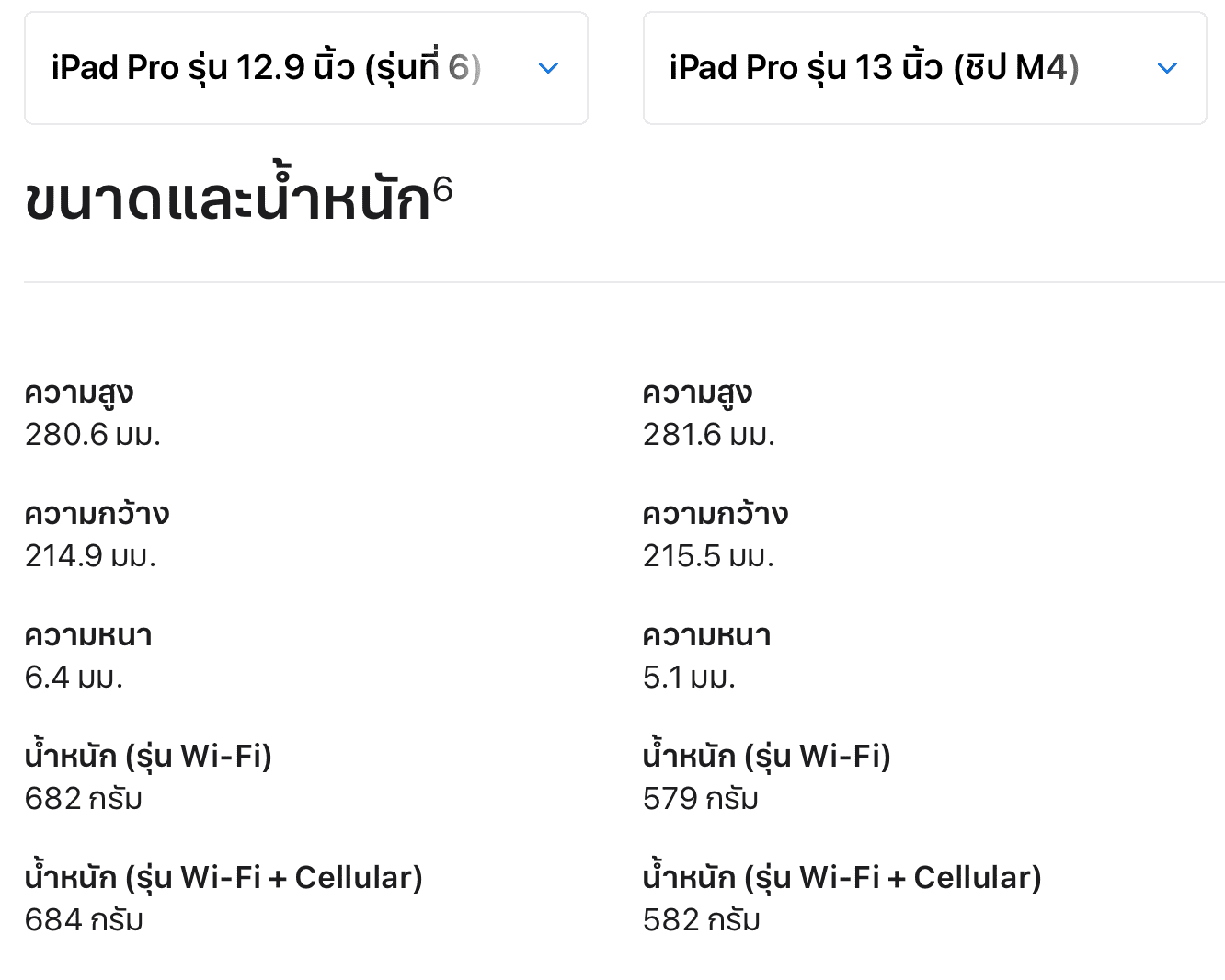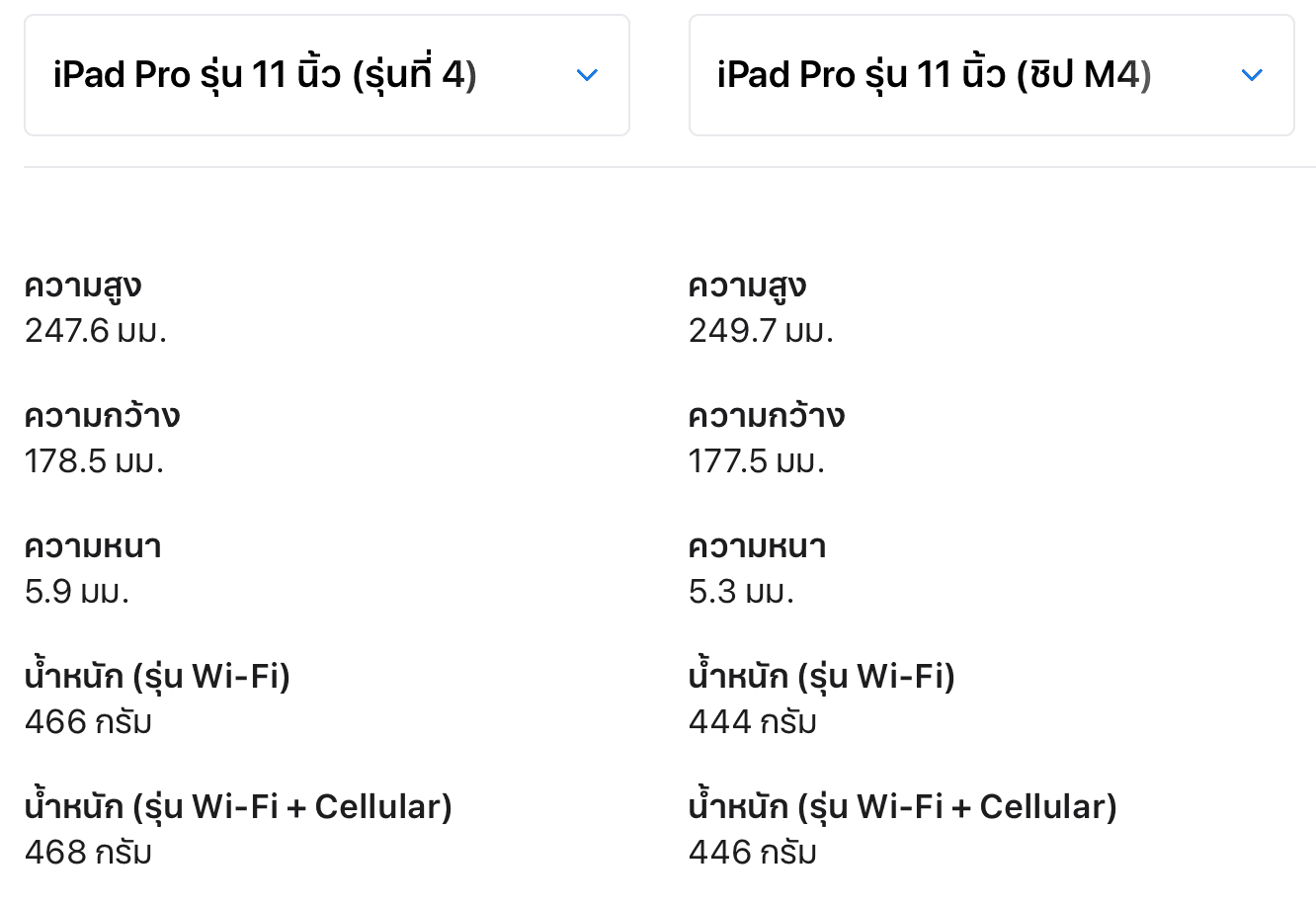 ส่วน iPad Pro ชิป M4 นั้น สเปครุ่นย่อยมีความแตกต่างกันหลายจุด เช่น
