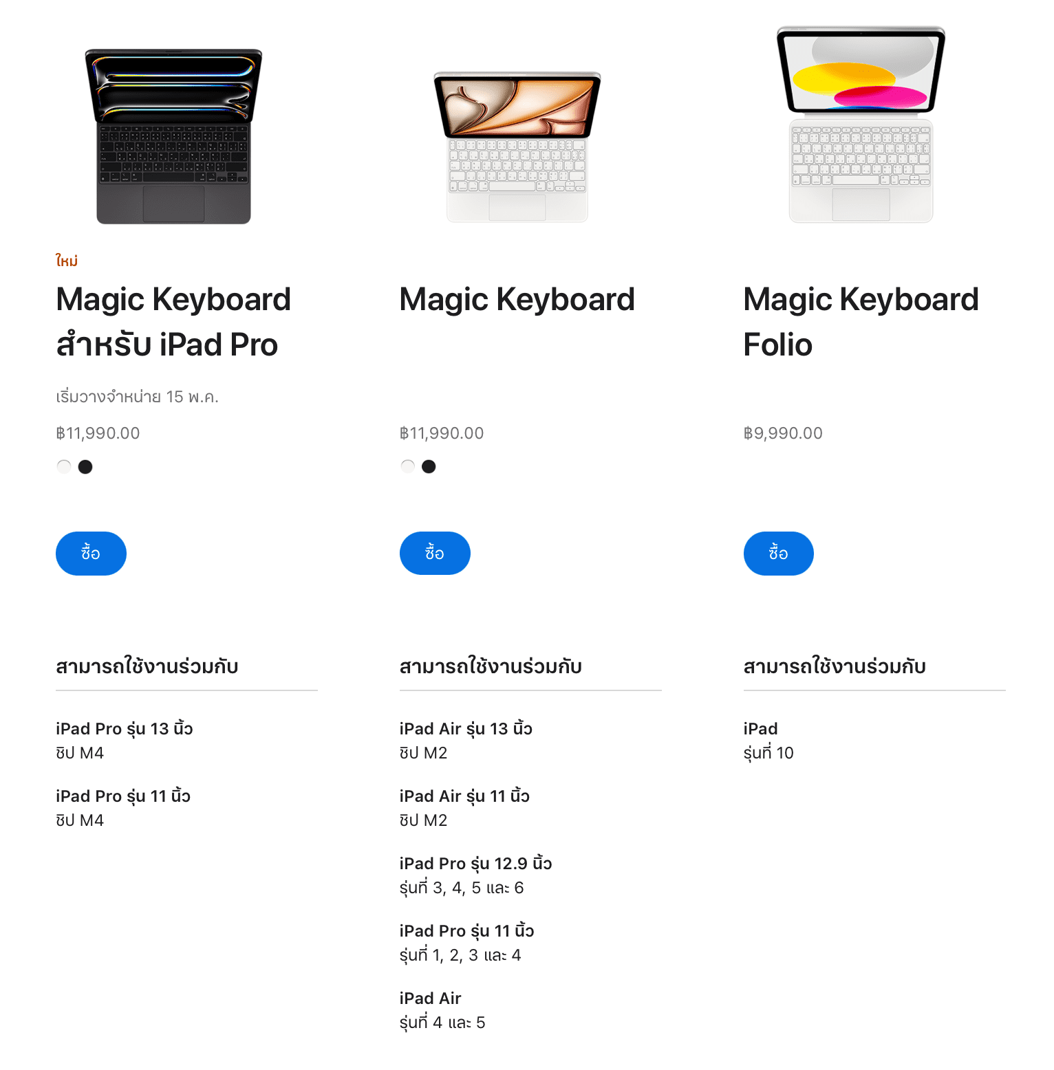 iPad Air (รุ่นที่ 6) ชิป M2 ยังคงรองรับ Magic Keyboard สำหรับ iPad Air และ iPad Pro 11″, 12.9″ ชิป M2 รุ่นเก่า แต่ไม่รองรับ Magic Keyboard สำหรับ iPad Pro ชิป M4 รุ่นใหม่