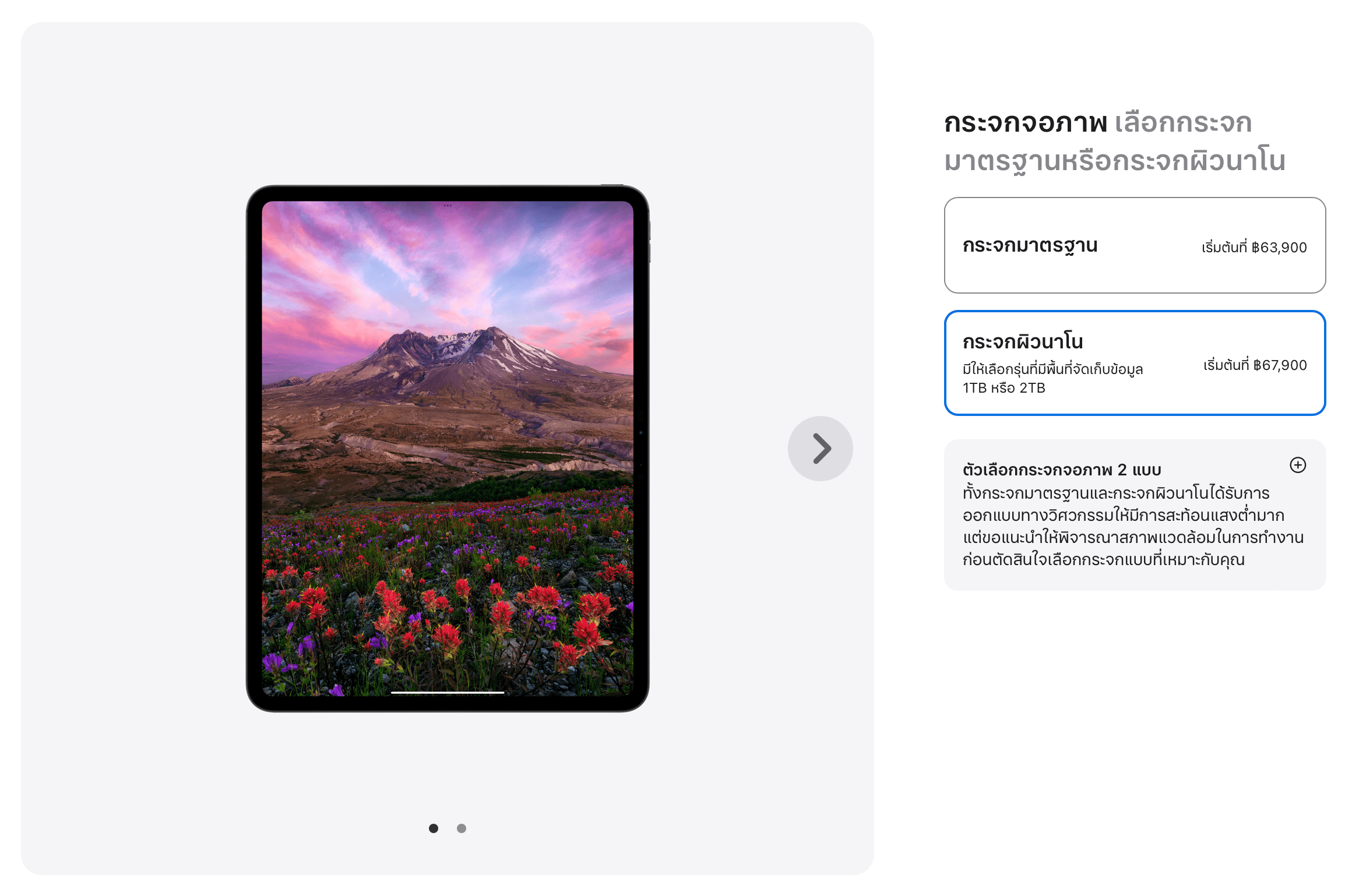 สำหรับ iPad Pro ชิป M4 นั้น หากเลือกซื้อในรุ่นความจุ 1TB, 2TB จะมีตัวเลือกกระจกมาตรฐาน และ “กระจกผิวนาโน” ให้เลือก โดยกระจกผิวนาโนเพิ่มเงินประมาณ 4,000 บาท ซึ่งมีคุณสมบัติลดการสะท้อนของหน้าจอตามสภาวะแสงต่าง ๆ