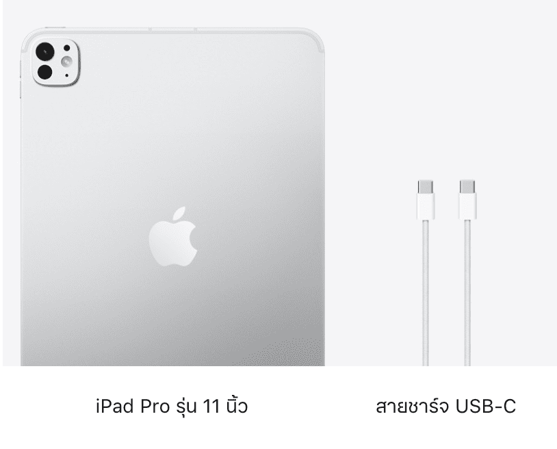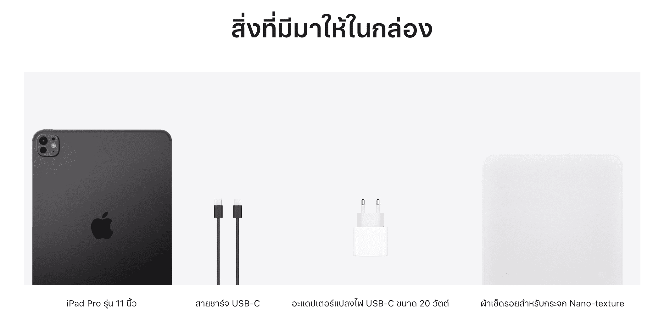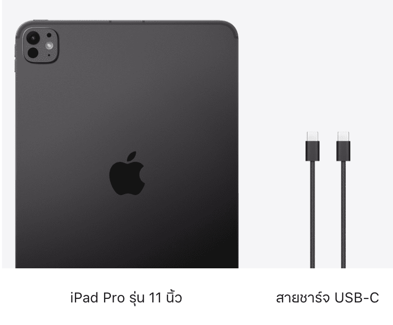 iPad Air (รุ่นที่ 6) ชิป M2 จะมีสายชาร์จ USB-C to USB-C สีขาวมาให้ในกล่องไม่ว่าจะกดสั่งซื้อสีตัวเครื่องสีไหนก็ตาม แต่ใน iPad Pro ชิป M4 นั้น หากกดสั่งซื้อสี Silver จะได้สายสีขาว ส่วนถ้ากดสี Space Black จะได้สายสีดำ