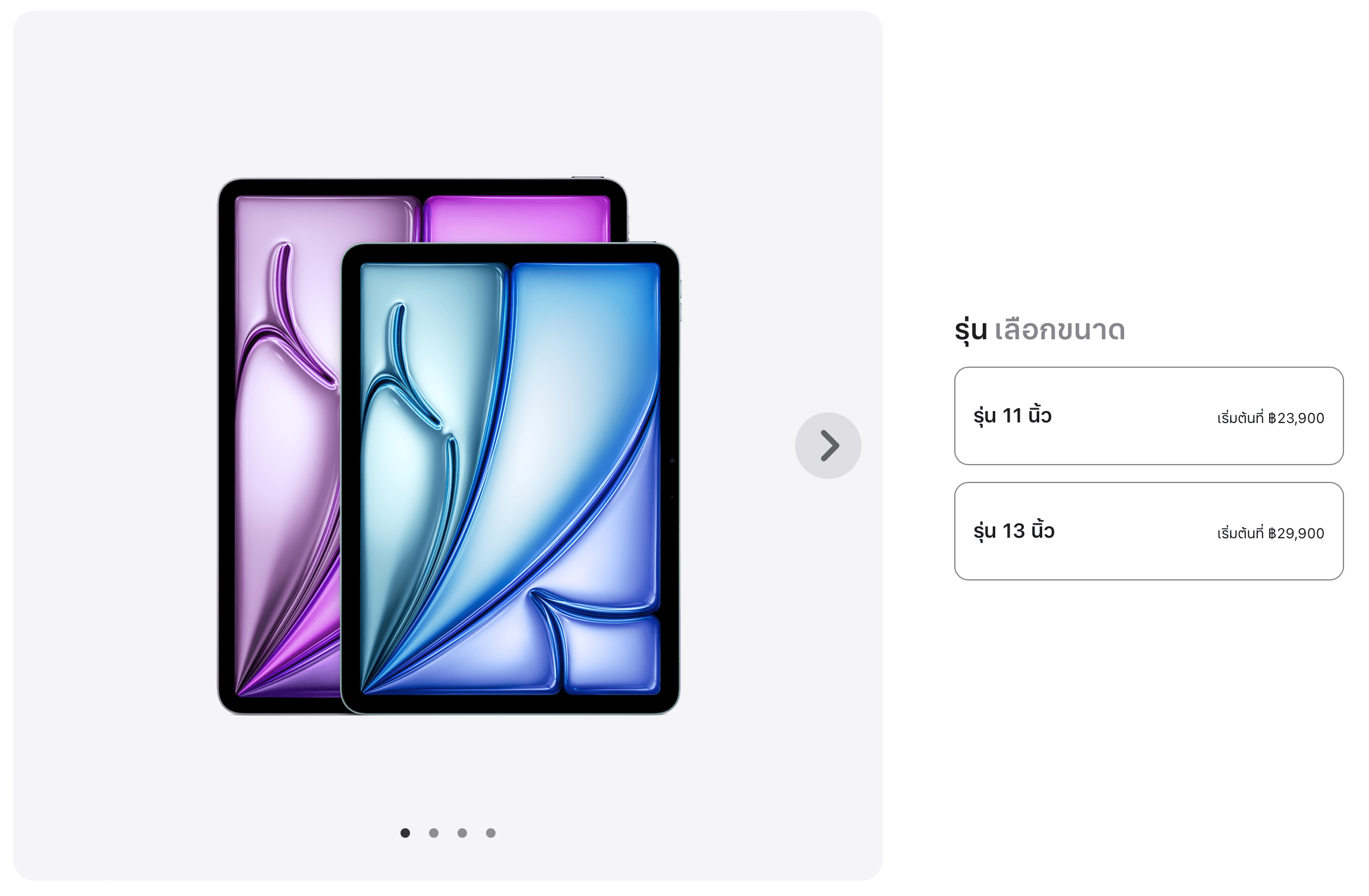 20 พ.ค. 2024, Apple ได้เปิดให้ลูกค้าสามารถกดสั่งซื้อ iPad Air (รุ่นที่ 6) ชิป M2, iPad Pro ชิป M4 เฉพาะรุ่น Wi-Fi ก่อน ส่วนรุ่น Wi-Fi+Cellular (ใส่ซิมรองรับ 5G) คาดว่าจะเปิดให้สั่งซื้อหลังจากรุ่น Wi-Fi ราว ๆ 2 สัปดาห์