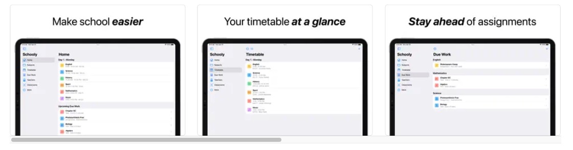 Schooly เป็นแอปจัดตารางเรียนสำหรับนักเรียนและนักศึกษาโดยเฉพาะ โดยเราจะต้องบันทึกวิชาเรียน อาจารย์ประจำวิชา ห้องเรียน เพื่อนำข้อมูลเหล่านี้ไปสร้างเป็นตารางเรียนประจำวัน รวมถึงมีส่วนของ Due Work ให้เราได้บันทึกสิ่งที่ต้องทำ พร้อมกับกำหนดการแจ้งเตือนล่วงหน้าได้ด้วย [ชมพรีวิวแอปที่นี่]