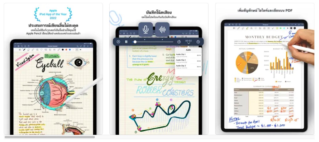 แอปจดโน้ตยอดนิยมของนักเรียนและนักศึกษา มาพร้อมเครื่องมือการจดบันทึกที่รองรับด้วยการเขียนหรือวาดด้วยเมาส์ แทร็กแพด และ Apple Pencil จดบันทึกบนกระดาษดิจิทัลอย่างอิสระ แต่งแต้มสีสันและไฮไลท์ส่วนที่ต้องการเน้นได้ ซิงก์การทำงานบนอุปกรณ์ Apple ได้อย่างไหลลื่น สะดวกมาก ๆ