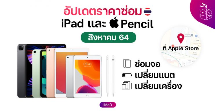 อัปเดตราคาซ่อม iPad และ Apple Pencil จาก Apple โดยในนี้จะประกอบไปด้วย ราคาการเปลี่ยนแบตเตอรี่และราคาเปลี่ยน iPad แบบยกเครื่อง (Replacement) ที่รวมไปถึงหน้าจอแตกมีทางเดียวคือการเปลี่ยนเครื่อง และอัตราเปลี่ยน Apple Pencil อัปเดตล่าสุด ส.ค 64 (2021)