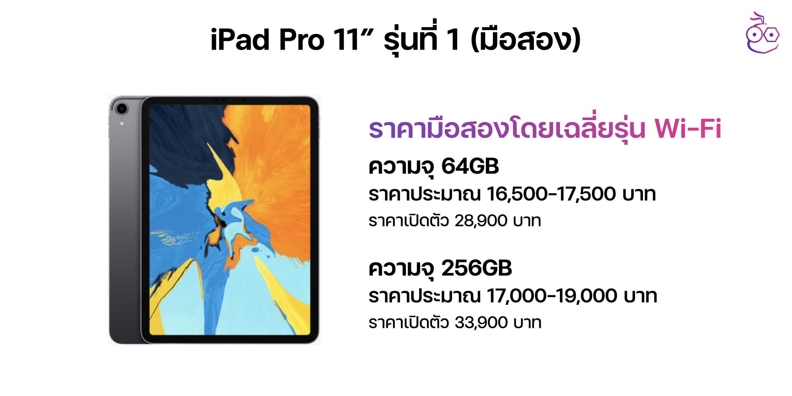 iPad Pro 11″ รุ่นที่ 1 ก็คือรุ่นปี 2018 มาพร้อมชิป A12X ราคาขายมือสองในท้องตลาดตอนนี้ทั้งรุ่น Wi-Fi และ Cellular ความจุ 64GB ราคาเฉลี่ยอยู่ที่ 16,500-17,500 บาท ส่วนรุ่นความจุ 256GB ราคาเฉลี่ยอยู่ที่ 17,000-19,000 บาท