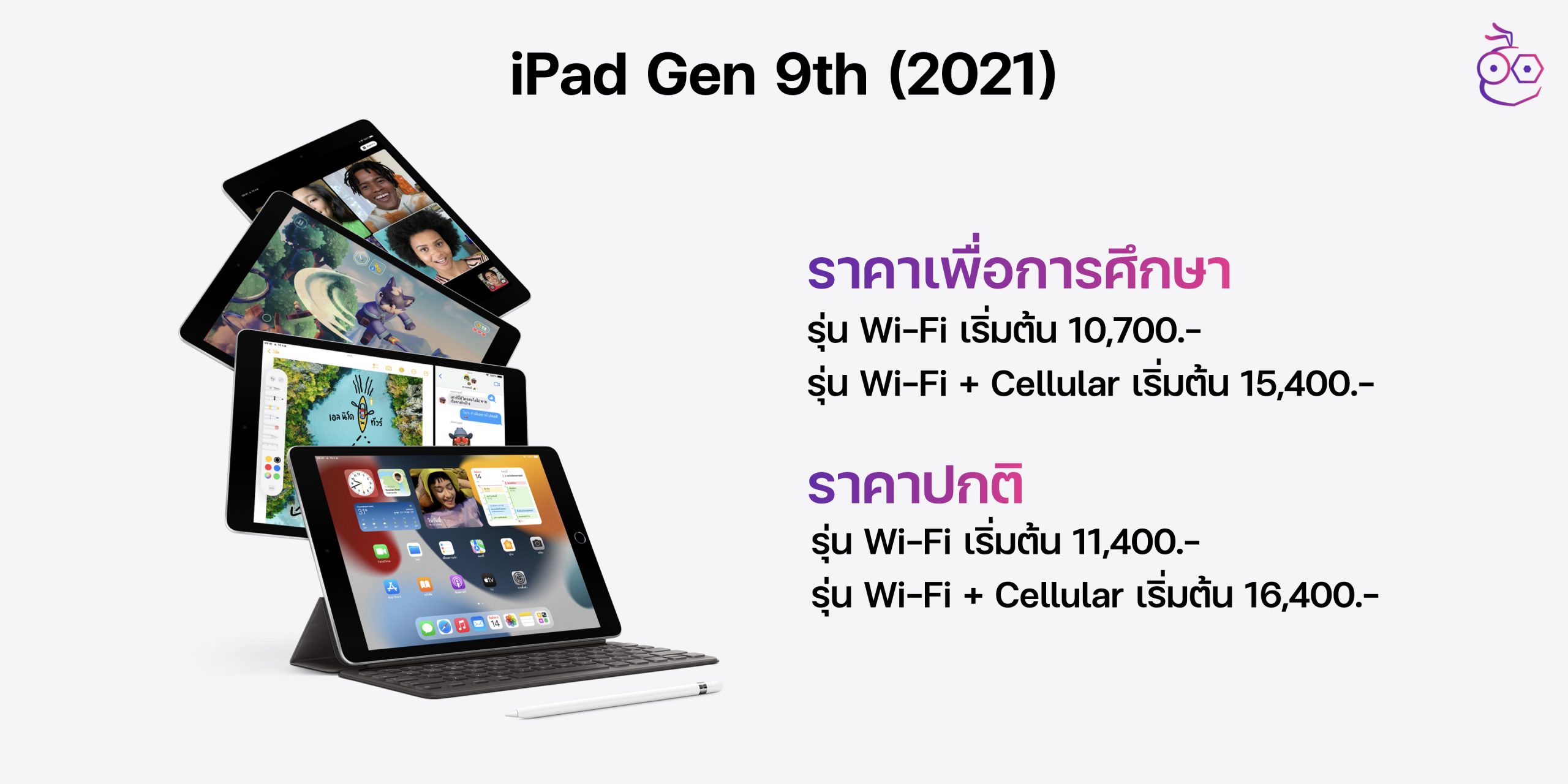 สำหรับ iPad Gen 9th นั้น Apple เปิดตัวไปเมื่อปี 2021 ที่ผ่านมา ซึ่งเรียกได้ว่าเป็น iPad รุ่นเริ่มต้น และเป็น iPad รุ่นราคาประหยัดที่ Apple เปิดตัวมาเพื่อตอบโจทย์สำหรับวัยนักเรียน นักศึกษาโดยเฉพาะ โดยราคาสำหรับนักศึกษาเริ่มต้นอยู่ที่ 10,700 บาท ส่วนราคาเต็มเริ่มต้นอยู่ที่ 11,400 บาท รุ่น Wi-Fi ส่วนรุ่น Cellular ราคาก็จะเพิ่มขึ้นอีก 4,700 บาท