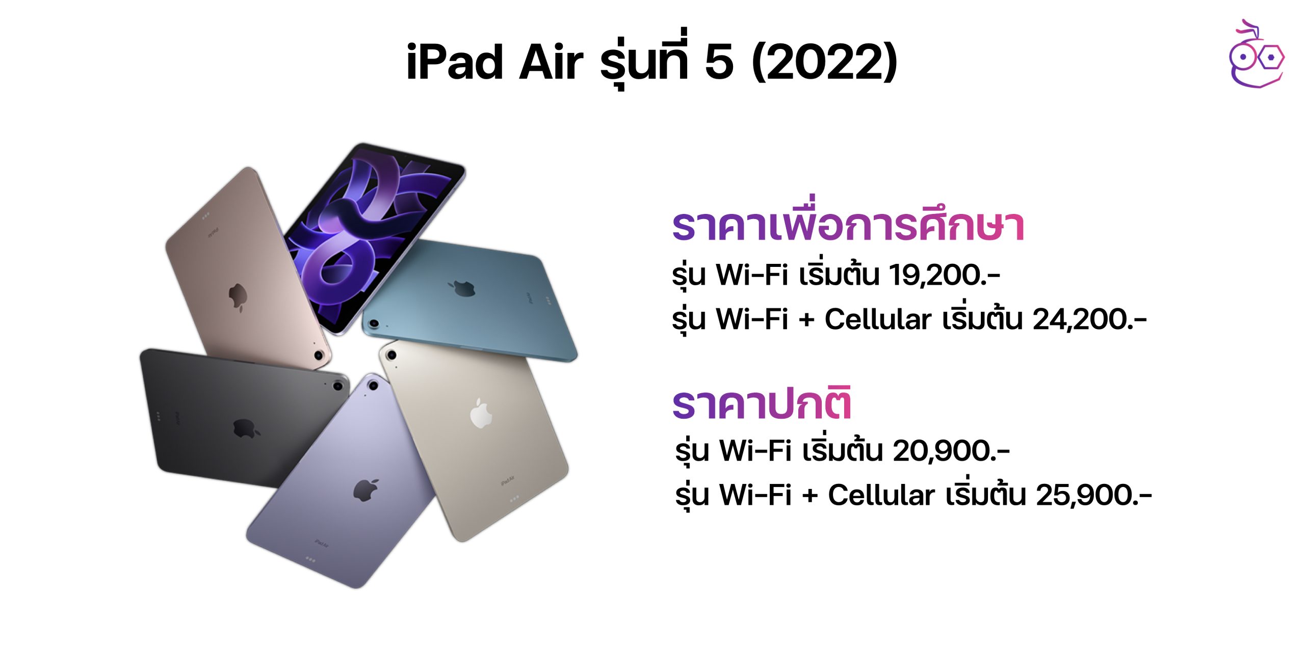 มาดู iPad รุ่นท็อปขึ้นมาอีกนิด ก็คือ iPad Air รุ่นที่ 5 ที่พึ่งเปิดตัวไปเมื่อวันที่ 8 มี.ค. ปี 2022 ที่ผ่านมา ราคาสำหรับนักศึกษาเริ่มต้นอยู่ที่ 19,200 บาท ส่วนราคาเต็มเริ่มต้นอยู่ที่ 20,900 บาท รุ่น Wi-Fi ส่วนรุ่น Cellular ราคาก็จะเพิ่มขึ้นอีก 5,000 บาท