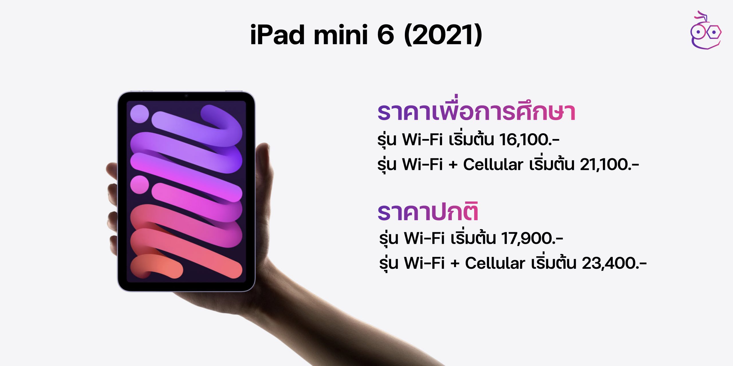 ส่วน iPad รุ่นสุดท้ายสำหรับนักเรียน/นักศึกษาที่ทีมงานอยากแนะนำคือ iPad mini รุ่นที่ 6 ซึ่งเป็น iPad รุ่นขนาดกระทัดรัด มาพร้อมกับพลังใหญ่ในร่างเล็ก เปิดตัวไปเมื่อปี 2021 ที่ผ่านมา ราคาสำหรับนักศึกษาเริ่มต้นอยู่ที่ 16,100 บาท ส่วนราคาเต็มเริ่มต้นอยู่ที่ 17,900 บาท รุ่น Wi-Fi ส่วนรุ่น Cellular ราคาก็จะเพิ่มขึ้นอีก 5,000 บาท