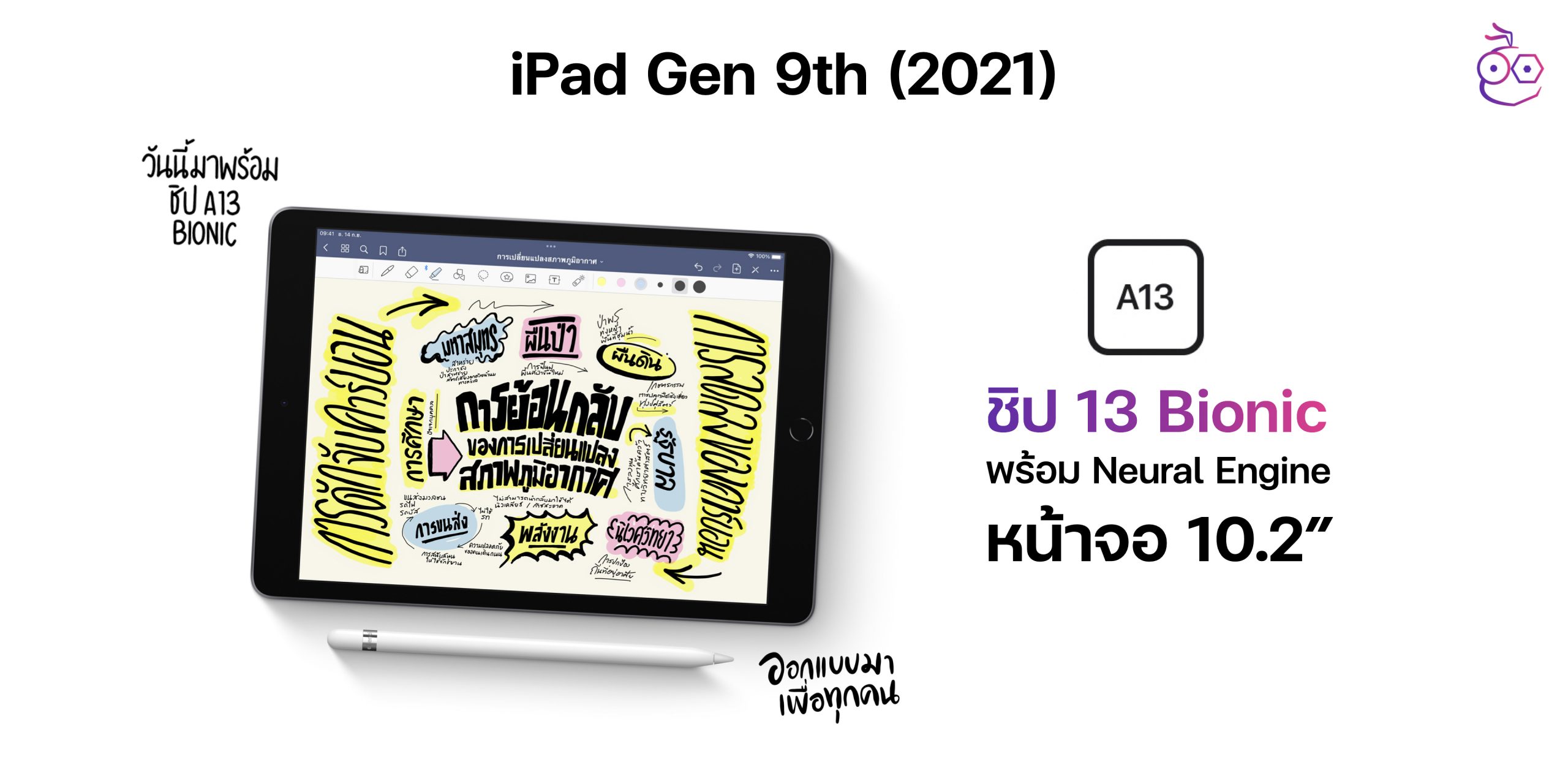 สำหรับ iPad Gen 9th นั้นมีขนาดหน้าจอ 10.2″ มาพร้อมชิป A13 Bionic ตัวเดียวกับที่ใช้ใน iPhone 11 ซึ่งถือเป็นจุดเด่นอย่างหนึ่งที่ทำให้ตัวเครื่องตอบสนองได้ไวและมีประสิทธิภาพดีขึ้นจาก iPad Gen 8th รุ่นก่อนหน้า ไม่ว่าจะจดโน๊ต จดเลคเชอร์ ทำสไลด์ เล่นเกม วาดรูป หรือตัดต่อวิดีโอก็ทำได้ลื่นไหล ไม่มีกระตุก