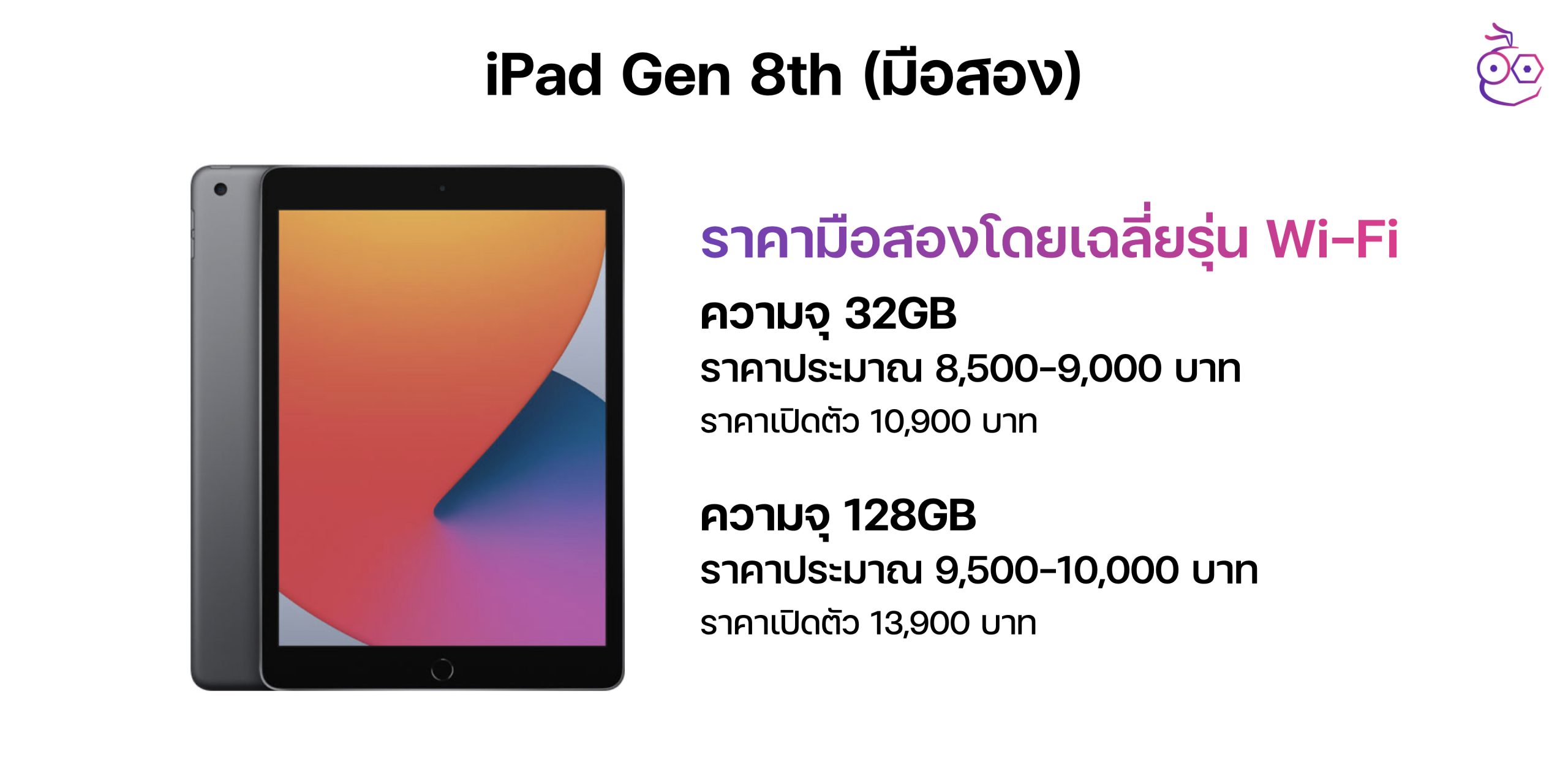 สำหรับ iPad Gen 8th ถือเป็น iPad รุ่นเริ่มต้นราคาย่อมเยาว์ที่ถือยังใช้งานได้ดีอยู่ ราคาเฉลี่ยในท้องตลาดเฉพาะรุ่น Wi-Fi ที่ขายอยู่ตอนนี้ คือ