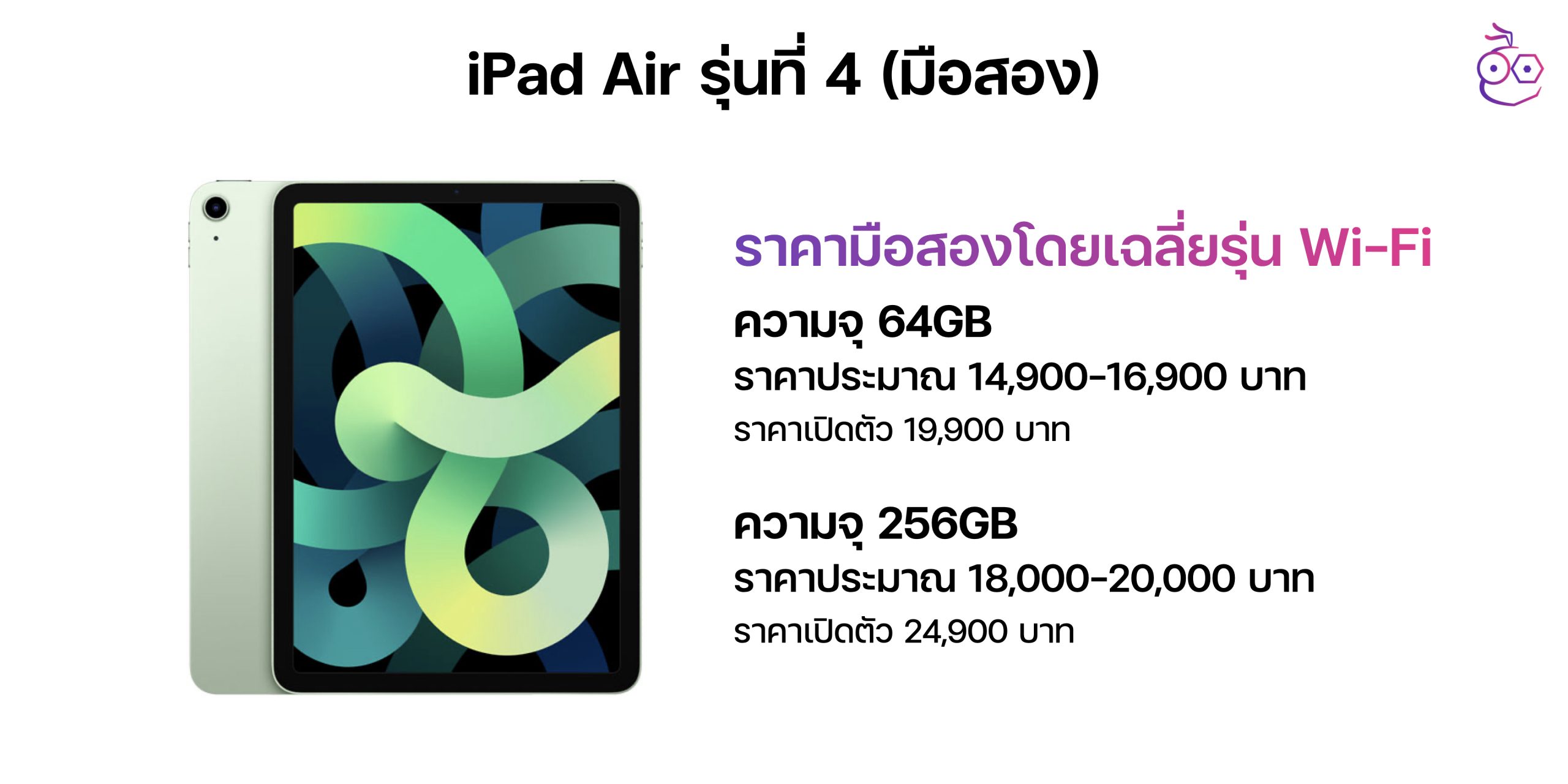 ส่วน iPad Air 4 มือสองก็ยังถือเป็น iPad Air ที่ใช้งานได้ดีและเป็นตัวที่ Apple เปลี่ยนดีไซน์ใหม่ด้วย ราคาเฉลี่ยในท้องตลาดเฉพาะรุ่น Wi-Fi ที่ขายอยู่ตอนนี้ ส่วนใหญ่จะเป็นรุ่นความจุ 64GB ราคาประมาณ 14,900-16,900 บาท