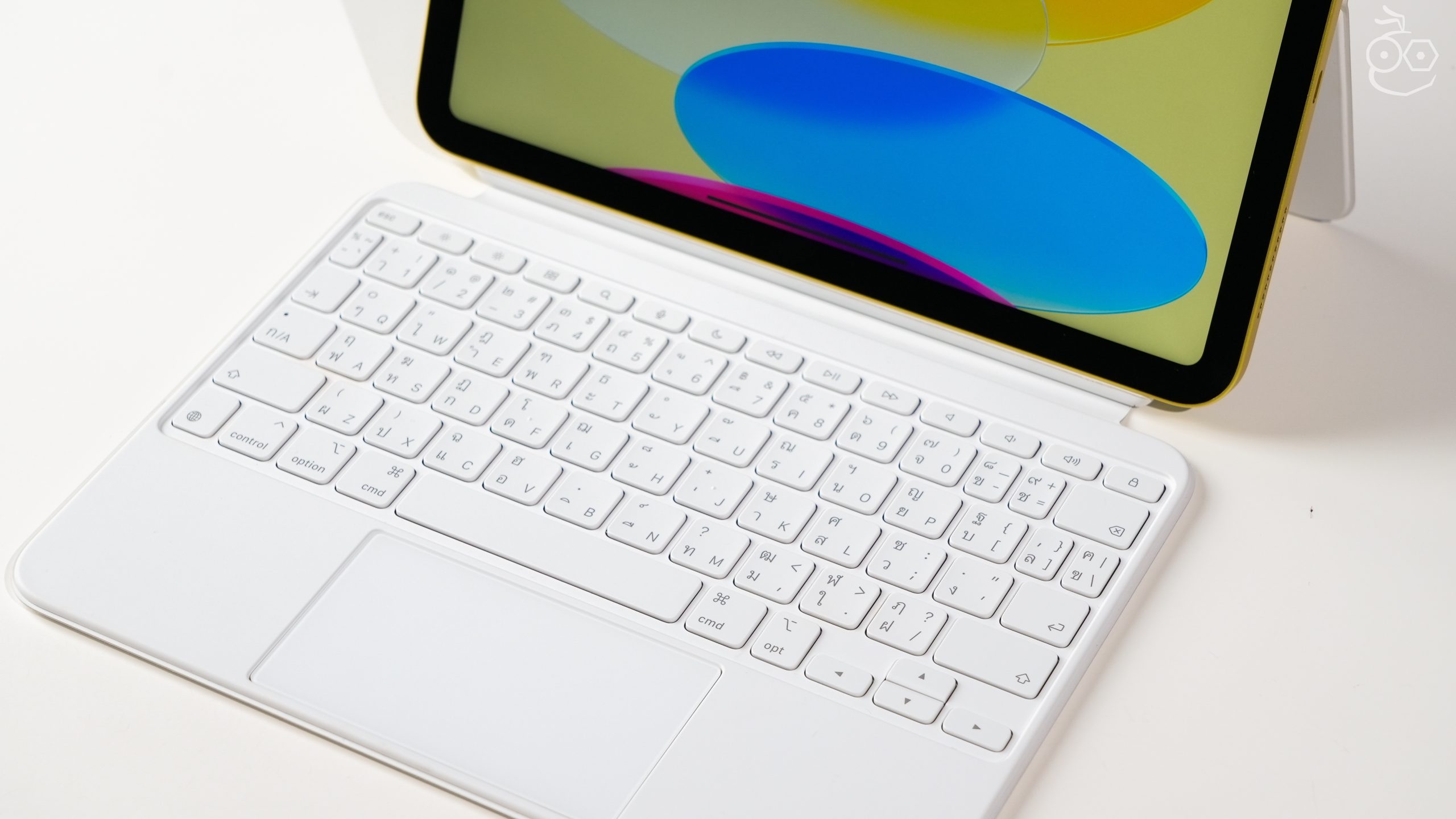และตัว Magic Keyboard ที่เชื่อมต่อกับตัวเครื่อง iPad รุ่นที่ 10 ด้วย Smart Connector ไม่ได้เชื่อมต่อผ่านบลูทูธ ดังนั้นจึงไม่ต้องกังวลเรื่องแบตเตอรี่ สามารถพกไปทำงานที่ไหนก็ได้ รวมถึงมีปุ่มฟังก์ชันมาให้เหมือนกับคีย์บอร์ดบนเครื่อง Mac เลย สะดวกต่อการใช้งานมากๆ ใครที่ทำงานเอกสารบน iPad บ่อย ๆ ตอบโจทย์แน่นอน