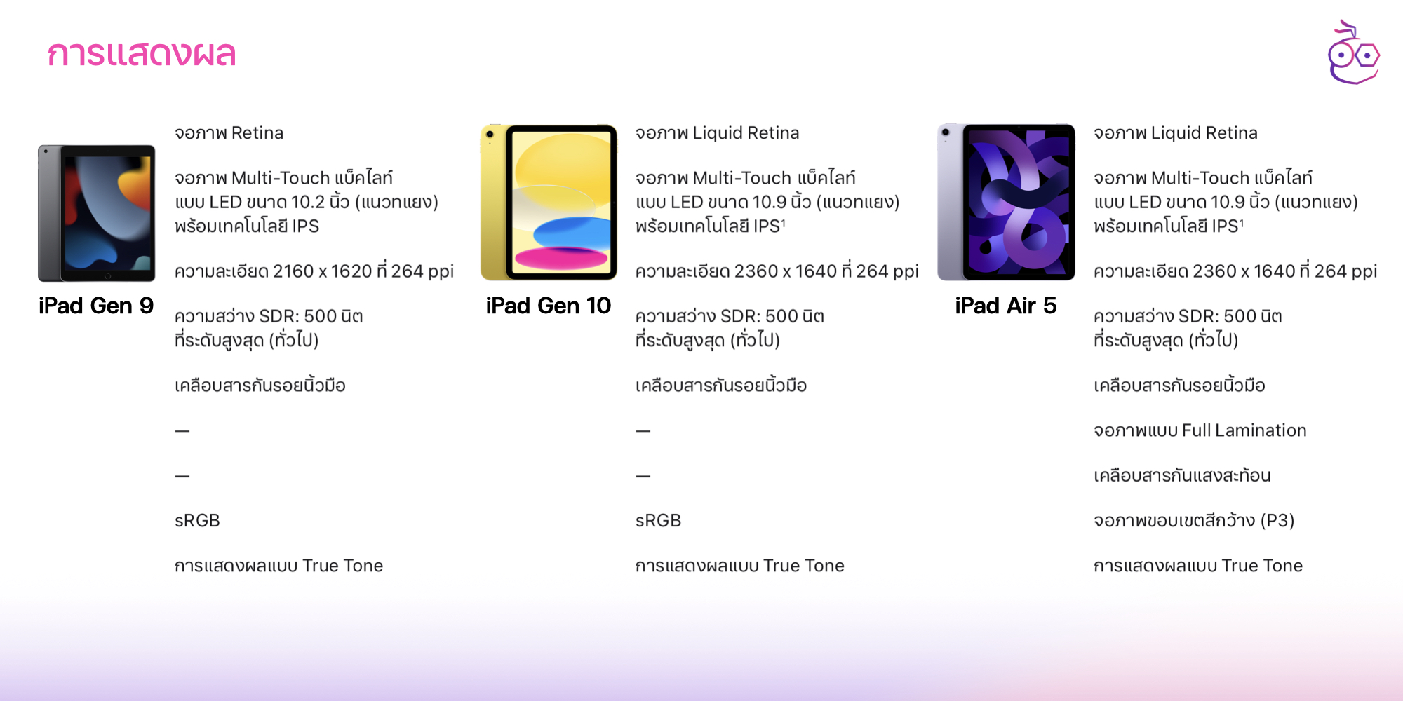 | หน้าจอ | Retina ขนาด 10.2″ | Liquid Retina ขนาด 10.9″ | Liquid Retina ขนาด 10.9″ |