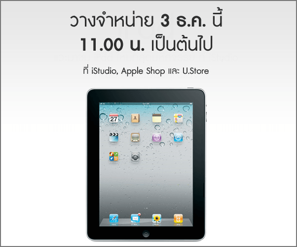 สำหรับรายละเอียดการจำหน่าย iPad ในประเทศไทย iStudio ได้แจ้งว่าจะเปิดขายในวันศุกร์ที่ 3 ธันวาคม 2553 ตั้งแต่ 11.00 น. เป็นต้นไป