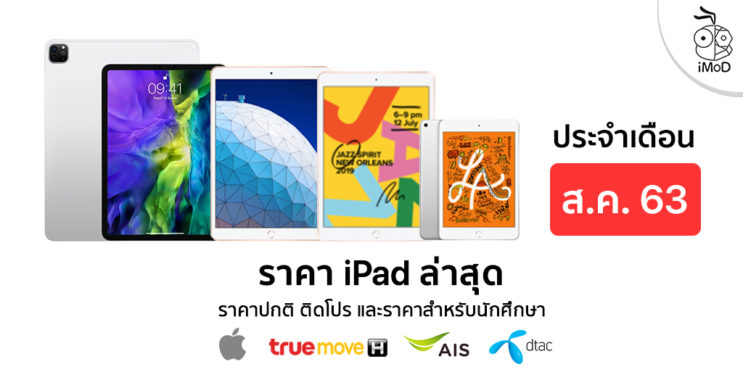 ข้อมูลนี้จะแสดงราคา iPad ที่วางจำหน่ายแต่ละรุ่น จาก Apple, TrueMove H, AIS และ Dtac ประจำเดือนสิงหาคม 2563 มีทั้งราคาปกติ ราคาโปรโมชันและราคาสำหรับนักศึกษา สามารถดูรายละเอียดเพิ่มเติมได้เลย