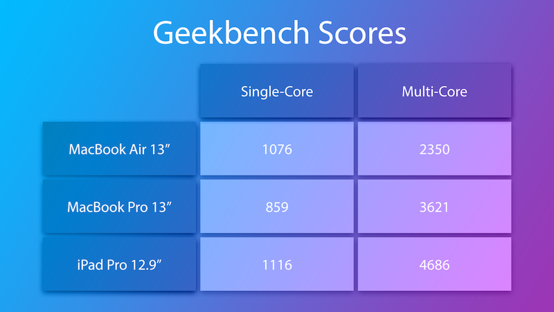 MacRumors ได้เปรียบเทียบ iPad Pro (2020), MacBook Pro 13 นิ้ว (Intel รุ่นที่ 8), MacBook Air (Intel รุ่นที่ 10) พบว่า iPad Pro มีคะแนนด้านประสิทธิภาพสูงที่สุด