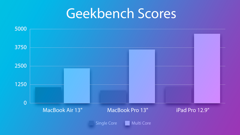 จากผลทดสอบคะแนนประสิทธิภาพด้วย Geekbench 5 เห็นได้ว่า iPad Pro มีคะแนนประสิทธิภาพสูงที่สุดแซงหน้า MacBook Pro, MacBook Air