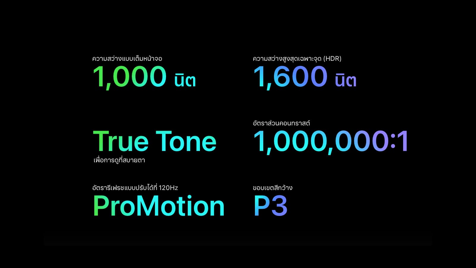 ในรุ่น 12.9″ ใช้หน้าจอ Mini-LED ที่ Apple เรียกว่า Liquid Retina XDR ซึ่งเป็นหน้าจอ ProMotion 120Hz เหมือนเดิม อัตราส่วน