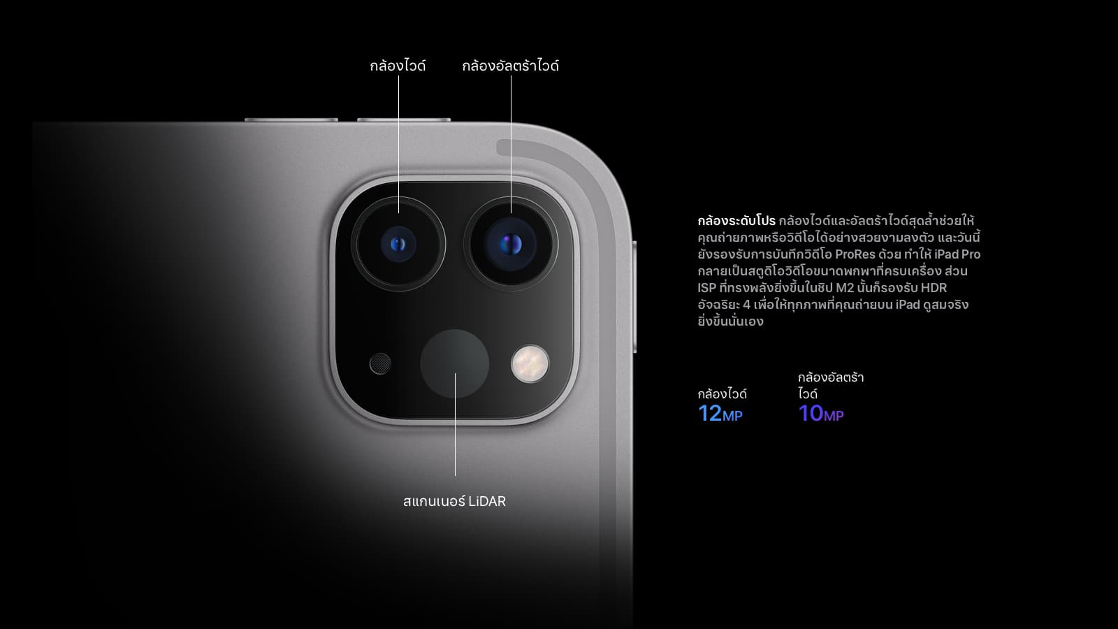 iPad Pro M2 ยังคงมาพร้อมกล้องหลัง 2 ตัว คือ กล้องเลนส์ไวด์ความละเอียด 12MP และกล้องอัลตร้าไวด์ความละเอียด 10MP และ LiDAR Scanner