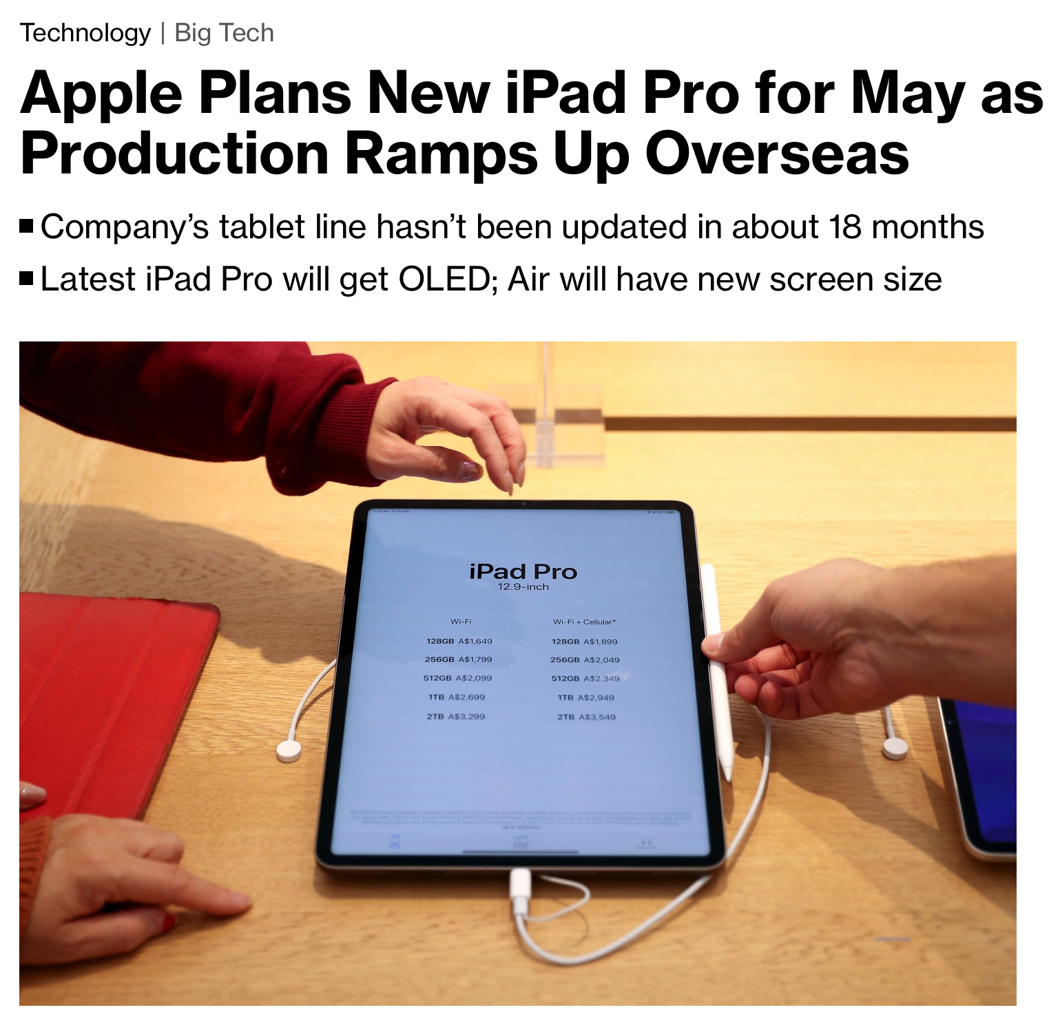 Mark Gurman รายงานว่า Apple อาจเปิดตัว iPad Pro จอ OLED, iPad Air ใหม่ในช่วงเดือน พ.ค. 2024 ซึ่งเป็นช่วงไม่กี่สัปดาห์ก่อนจะถึงงาน WWDC24 ที่จะจัดขึ้นวันที่ 10 มิ.ย. 2024