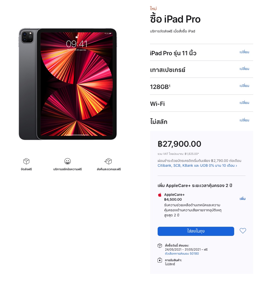 30 เม.ย. 64, Apple ได้เปิดให้สั่งซื้อล่วงหน้า iPad Pro ชิป M1 (2021) รุ่น Wi-Fi ได้แล้วที่ Apple Store ออนไลน์ ราคาเริ่มต้น 27,900 บาท