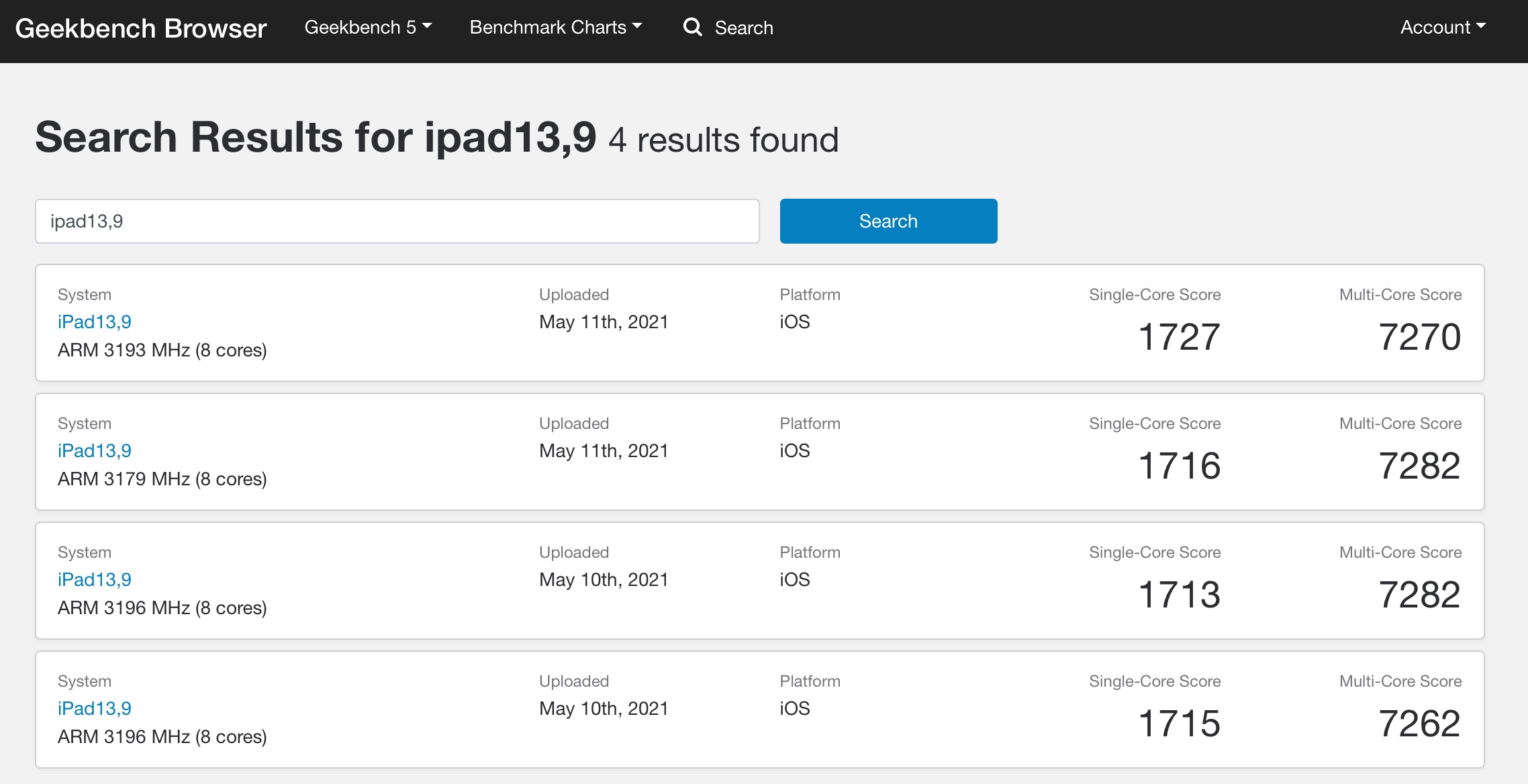 สำหรับคะแนน (เฉลี่ย) Single-Core ของ iPad Pro 12.9 นิ้วชิป M1 ได้คะแนน 1,718 คะแนน และ Multi-Core ได้ไป 7,284 คะแนน มากกว่า iPad Pro 12.9 นิ้วชิป A12Z ที่มี Single-Core (เฉลี่ย) 1,121 คะแนน และ Multi-Core 4,656 คะแนน