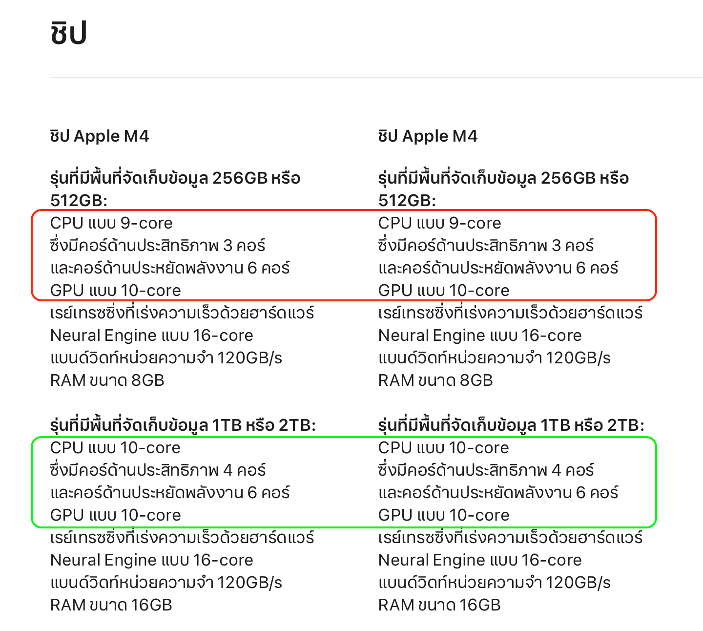 กล่าวคือ ใน iPad Pro ชิป M4 รุ่นความจุ 1TB, 2TB จะมี CPU-core ด้านประสิทธิภาพมากกว่ารุ่นความจุ 256GB, 512GB นั่นเอง