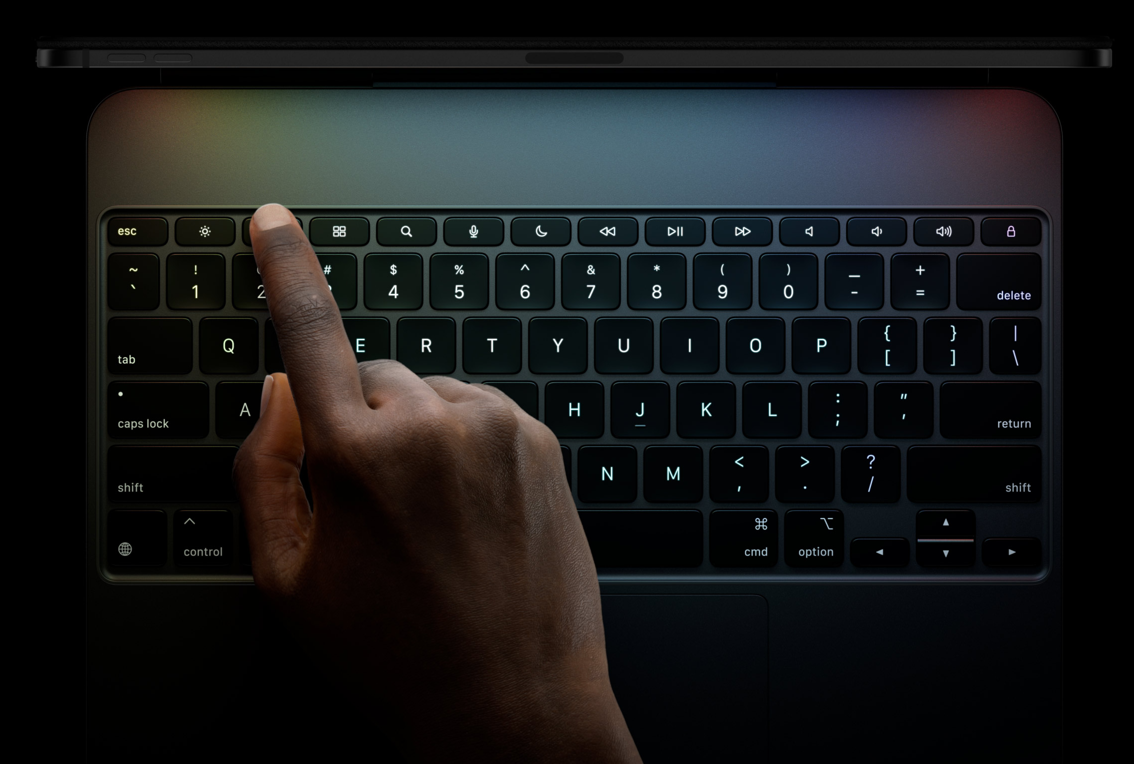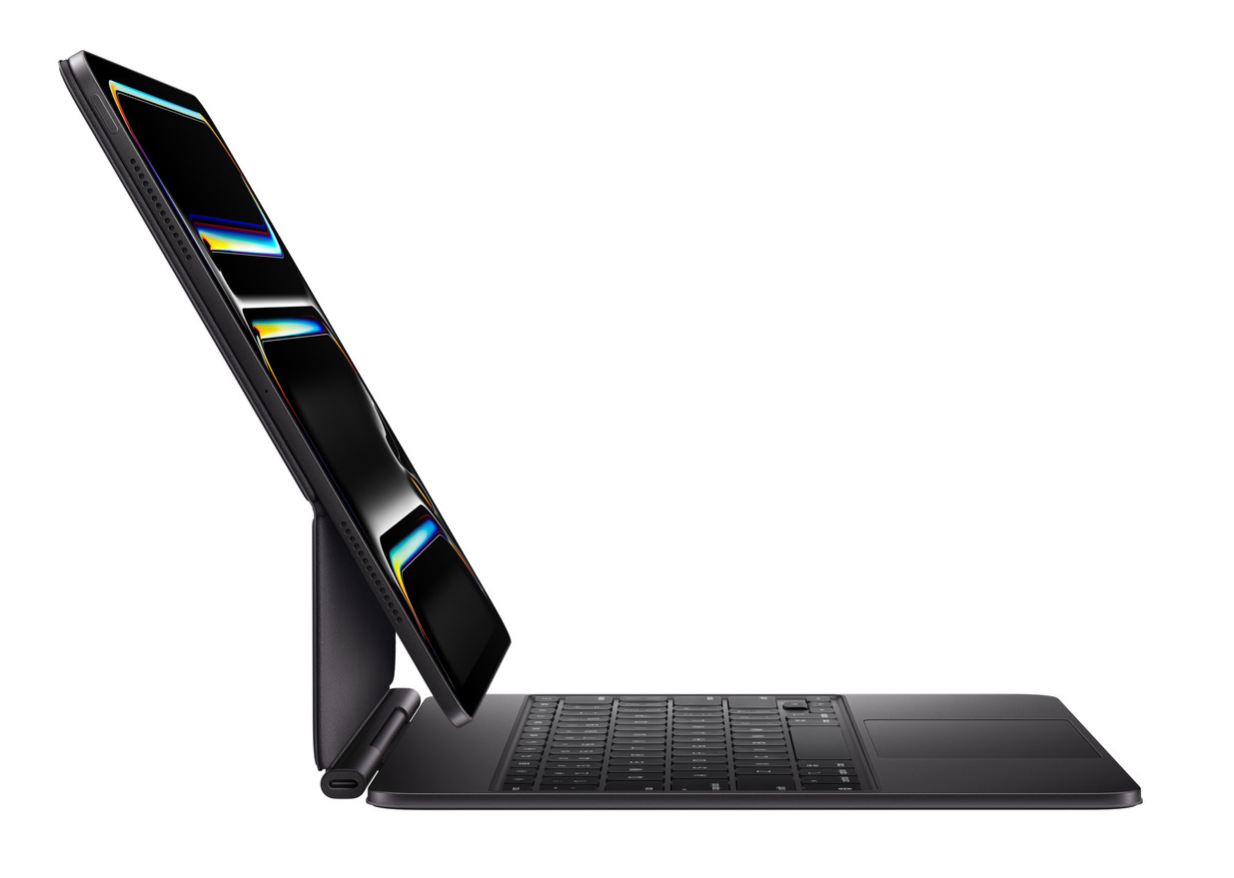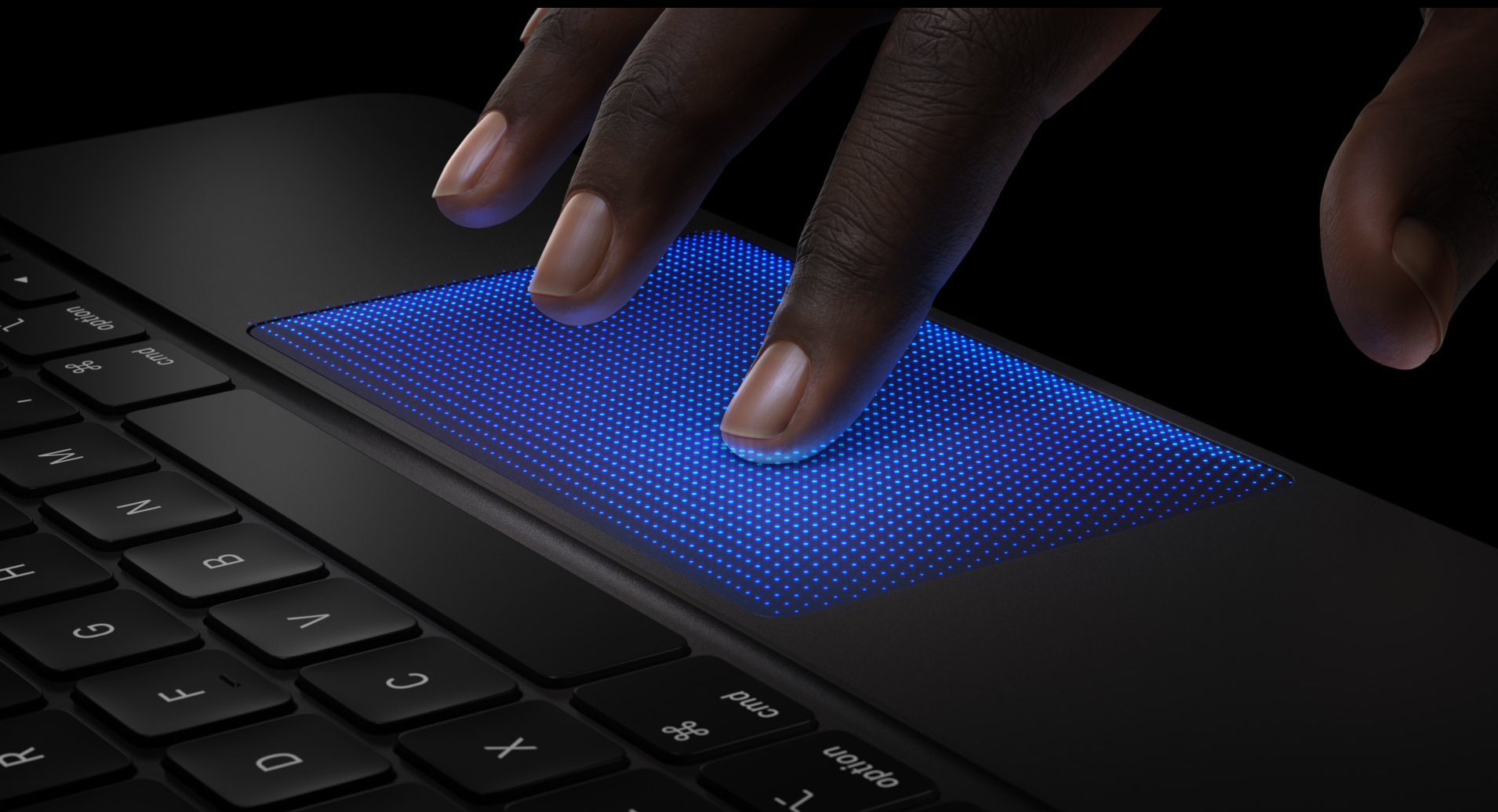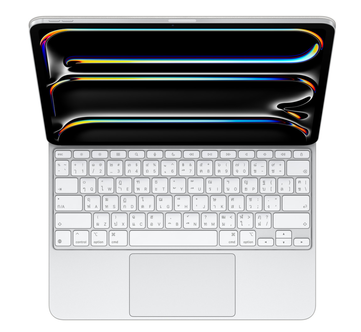 iPad Pro ชิป M4 รองรับ Magic Keyboard ใหม่ที่มาพร้อมดีไซน์ที่ช่วยให้ใช้งาน iPad Pro แบบยกลอย และตัว Magic Keyboard มาพร้อมปุ่ม fn และที่พักมือใช้วัสดุอะลูมิเนียม, Trackpad ขนาดใหญ่ ตอบสนองด้วยการสั่นได้ด้วย