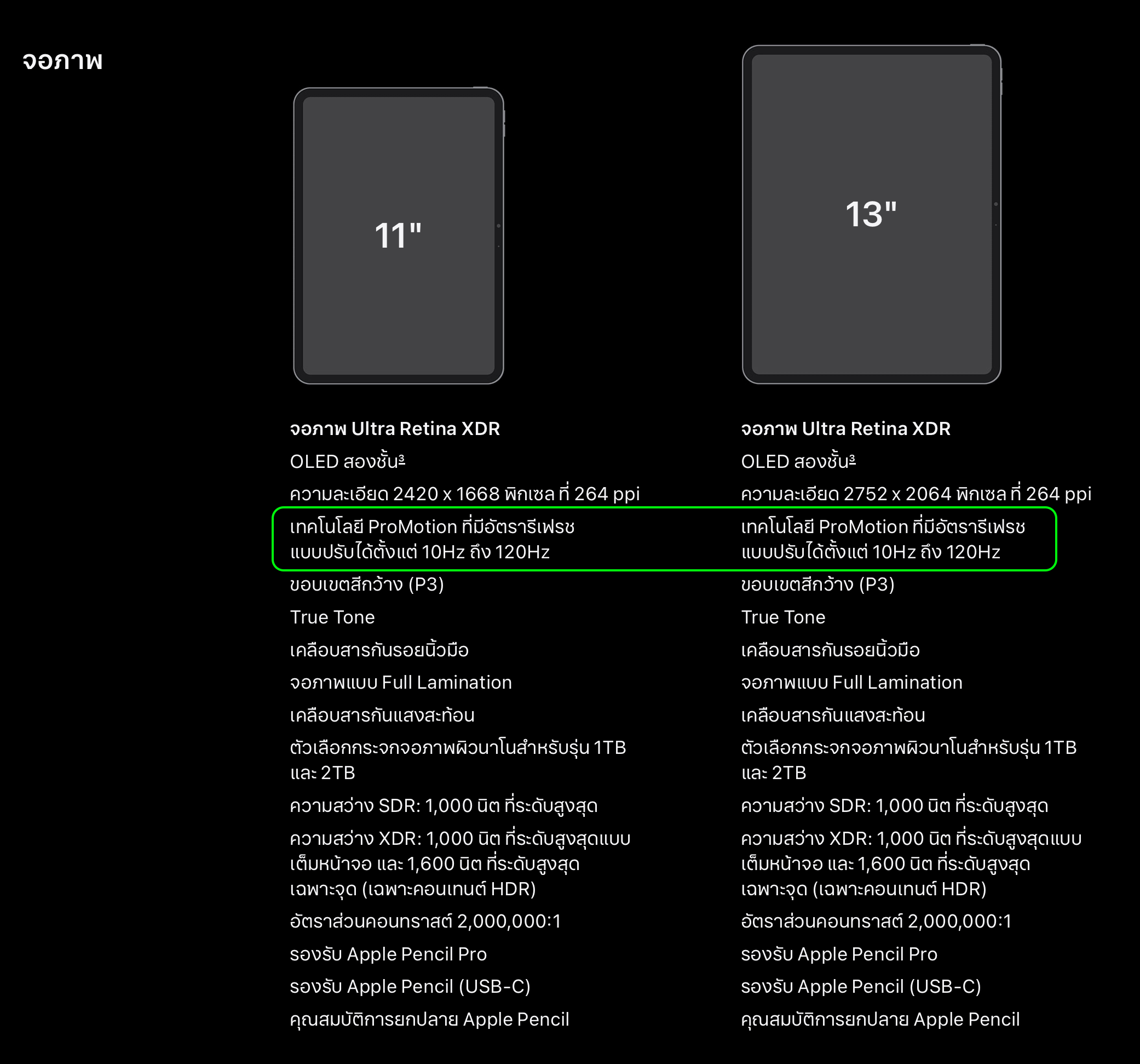 iPad Pro ในปี 2017 เป็น iPad รุ่นแรกที่รองรับ ProMotion 120Hz โดยสเปคตอนนั้นจะรองรับ Refresh Rate 24Hz-120Hz, และหลังจากนั้นเป็นต้นมา Apple ก็นำสเปคนี้มาใช้ใน iPad Pro ทั้งรุ่นหน้าจอ LED, mini-LED