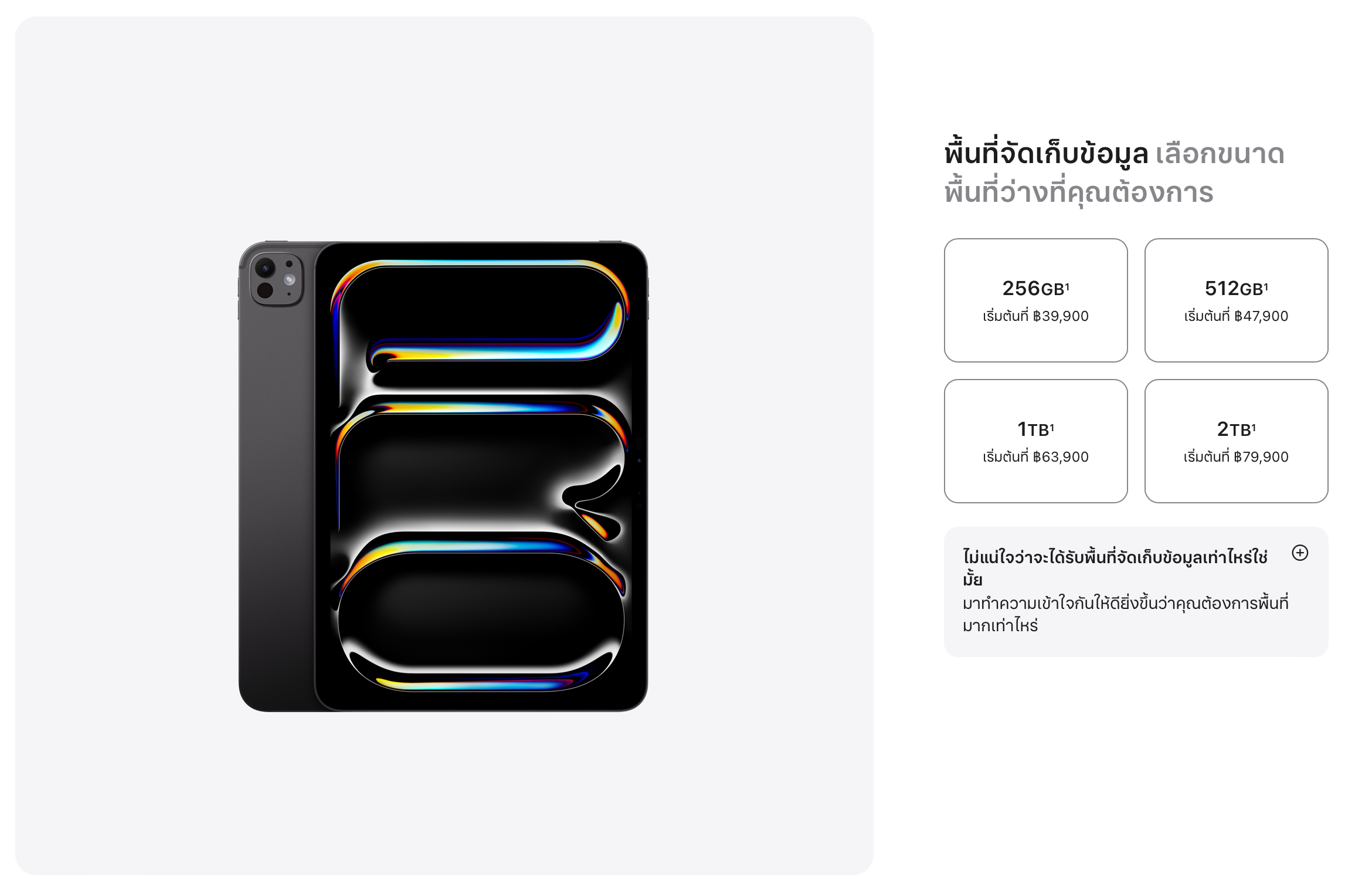 ใน iPad Pro ชิป M2 นั้น รุ่น 11″, 12.9″ จะมาพร้อมความจุเริ่มต้น 128GB แต่ใน iPad Pro ชิป M4 ปีนี้ทั้งรุ่น 11″, 13″ มาพร้อมความจุเริ่มต้น 256GB ทั้ง 2 รุ่น