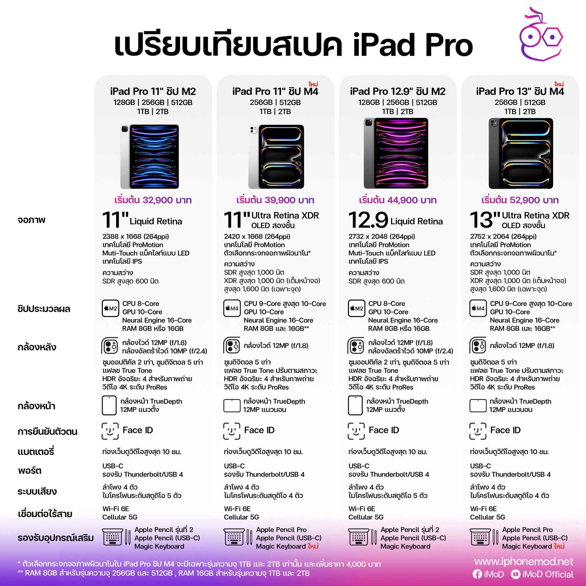 | iPad Pro ชิป M4 11″ | iPad Pro ชิป M2 11″ | iPad Pro ชิป M4 13” | iPad Pro ชิป M2 12.9” | |