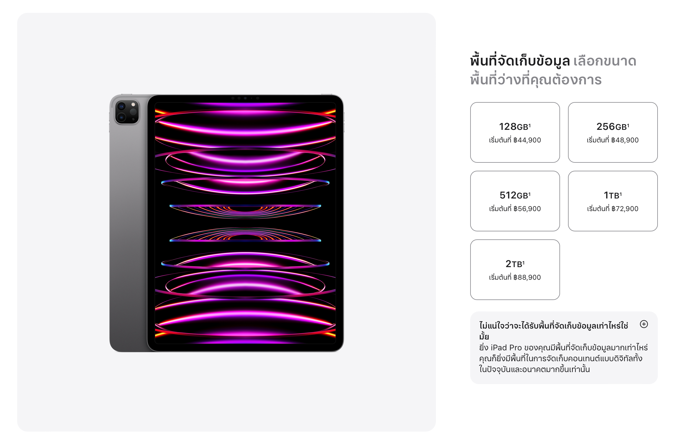 ตั้งแต่ปี 2021, Apple ใช้ความจุ iPad Pro ประกอบไปด้วย 128GB, 256GB, 512GB, 1TB และ 2TB เพื่อให้รองรับความสามารถของตัวเครื่องที่มีมากขึ้น อย่างเช่นการรองรับถ่ายวิดีโอ ProRes เป็นต้น