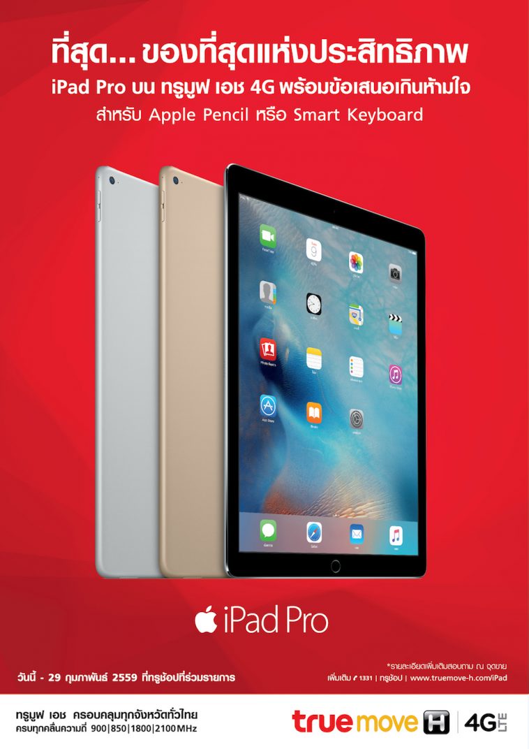 ซื้อ iPad Pro พร้อมรับฟรี Apple Pencil หรือ Smart Keyboard เงื่อนไขคือสำหรับลูกค้าใหม่ ลูกค้าปัจจุบันทรูมูฟ เอช หรือลูกค้าย้ายค่ายเบอร์เดิม