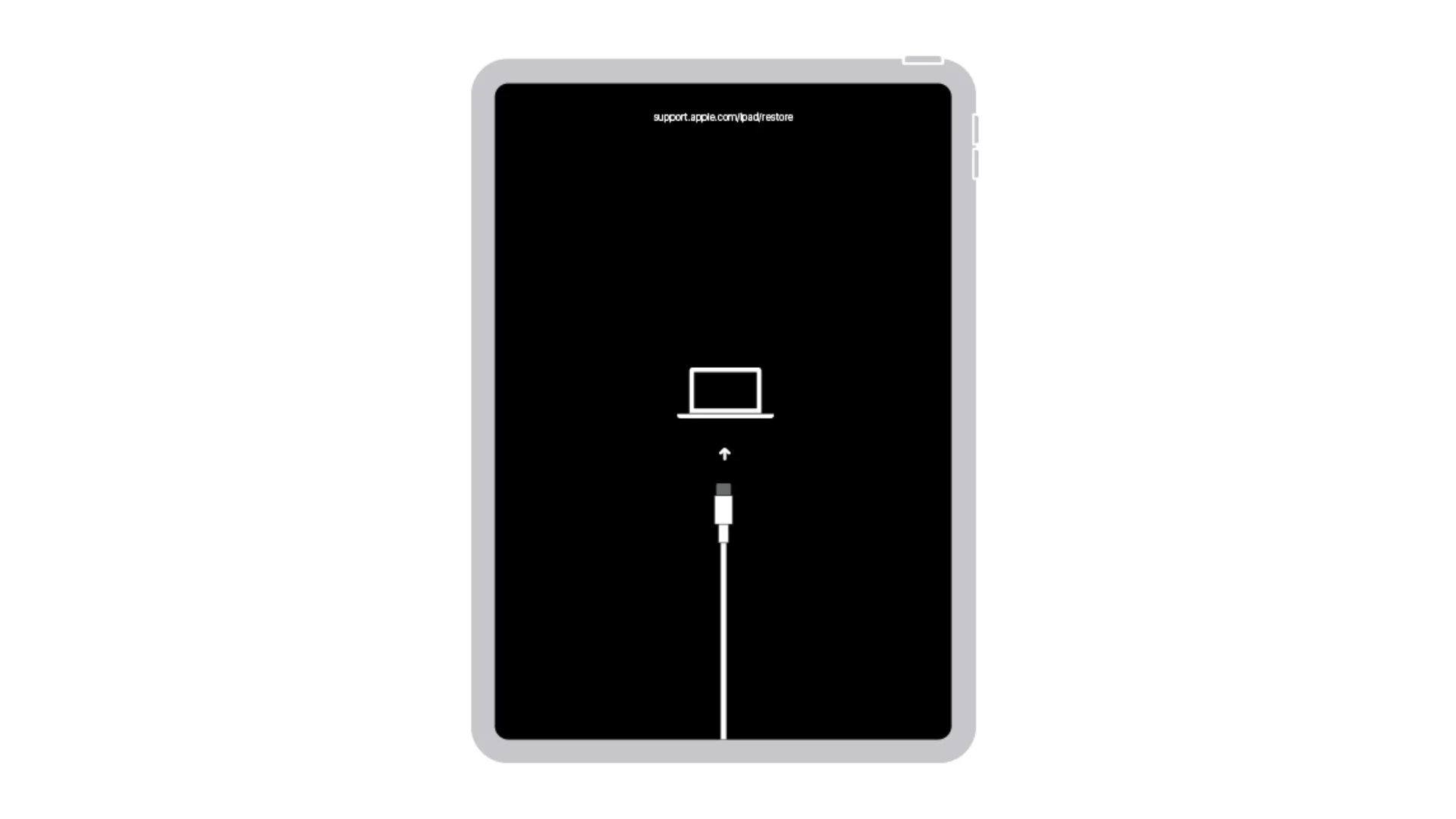 - กดปุ่ม Power (Sleep/Wake) ค้างไว้จนหน้าจอดับ จากนั้นหน้าจอจะแสดงโลโก้สายเชื่อมต่อ (Cable to Computer) หรือ Recovery Mode
