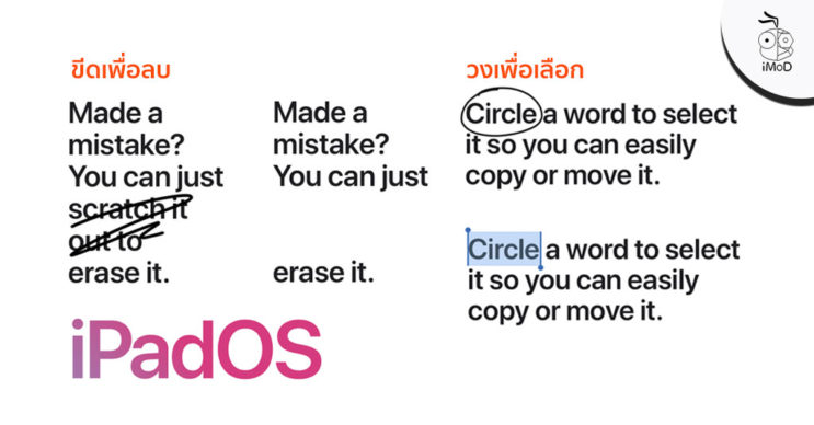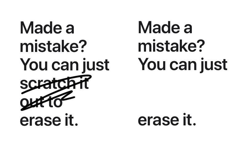 ผู้ใช้สามารถใช้ Apple Pencil ขีดที่ข้อความที่ไม่ต้องการ จากนั้นข้อความที่ขีดก็จะถูกลบออกไป