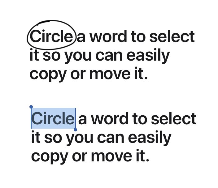 นอกจากนั้นหากผู้ใช้ใช้ Apple Pencil วงกลมที่ข้อความก็จะเป็นการเลือกข้อความ (Select) ซึ่งง่ายกกว่าการแตะค้างไว้แล้วลากแบบเดิม