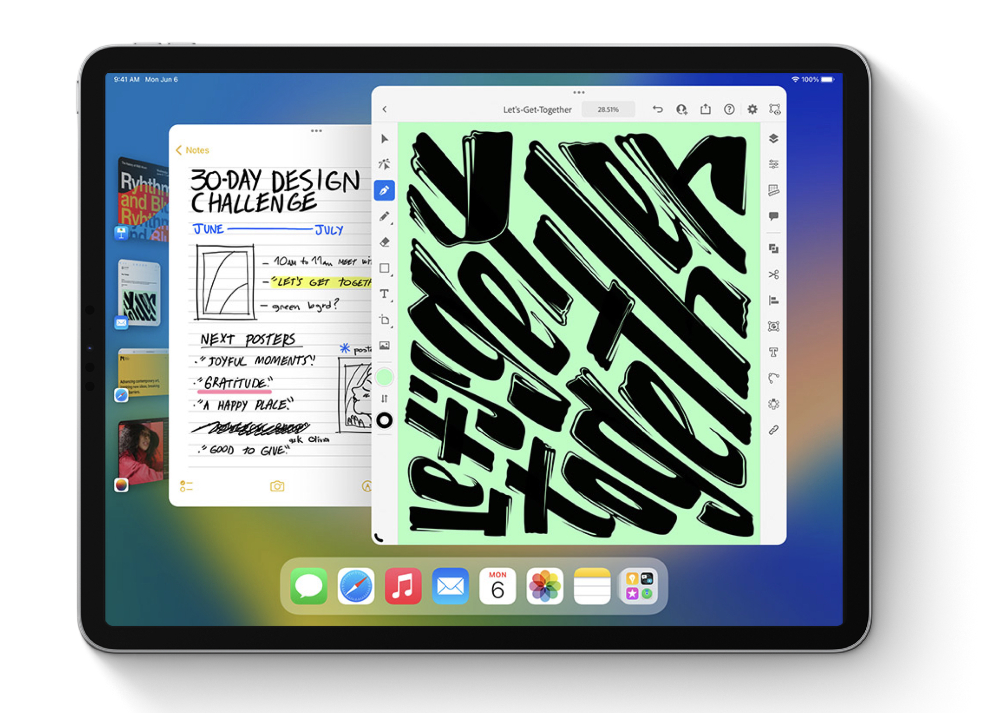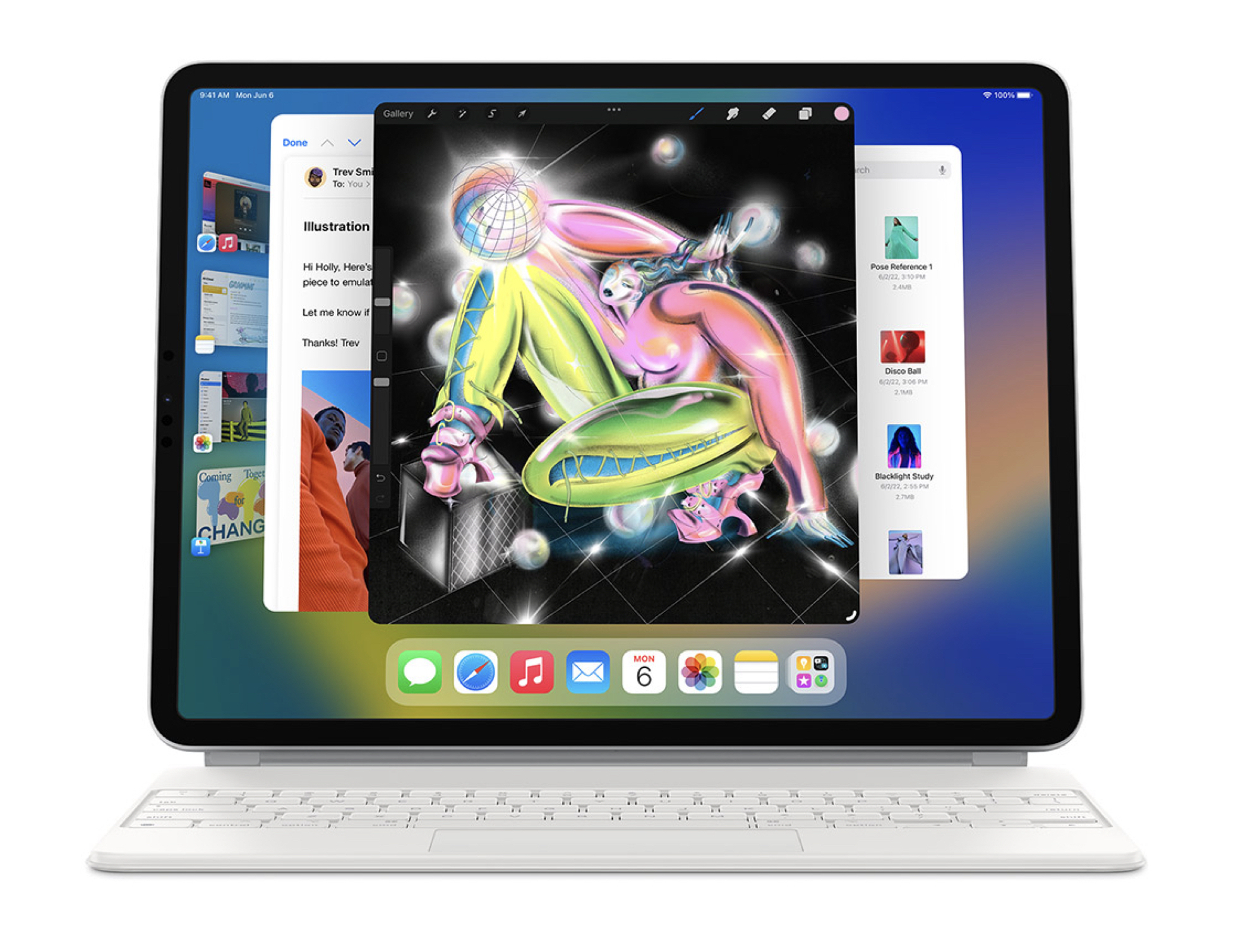Stage Manager คือประสบการณ์การทำงานหลายอย่างพร้อมกันแบบใหม่ที่จัดระเบียบแอปและหน้าต่างโดยอัตโนมัติ ทำให้สลับไปมาระหว่างงานต่าง ๆ ได้อย่างรวดเร็วและง่ายขึ้น เป็นครั้งแรกบน iPad ที่ผู้ใช้สามารถสร้างหน้าต่างซ้อนขนาดต่าง ๆ ในมุมมองเดียว ลากและวางหน้าต่างจากด้านข้าง หรือเปิดแอปจาก Dock เพื่อสร้างกลุ่มแอปสำหรับการทำงานหลายอย่างพร้อมกันที่รวดเร็วและยืดหยุ่นมากยิ่งขึ้น