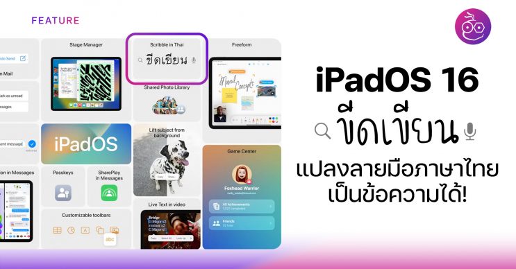 ในหน้าสรุปคุณสมบัติของ iPadOS 16 ได้มีฟีเจอร์ตัวหนึ่งเตะตาผู้ชมชาวไทยมาก เพราะมีภาษาไทยคำว่า “ขีดเขียน” แสดงอยู่ ซึ่งเป็นฟีเจอร์ Scribble ของ iPad นั่นเอง