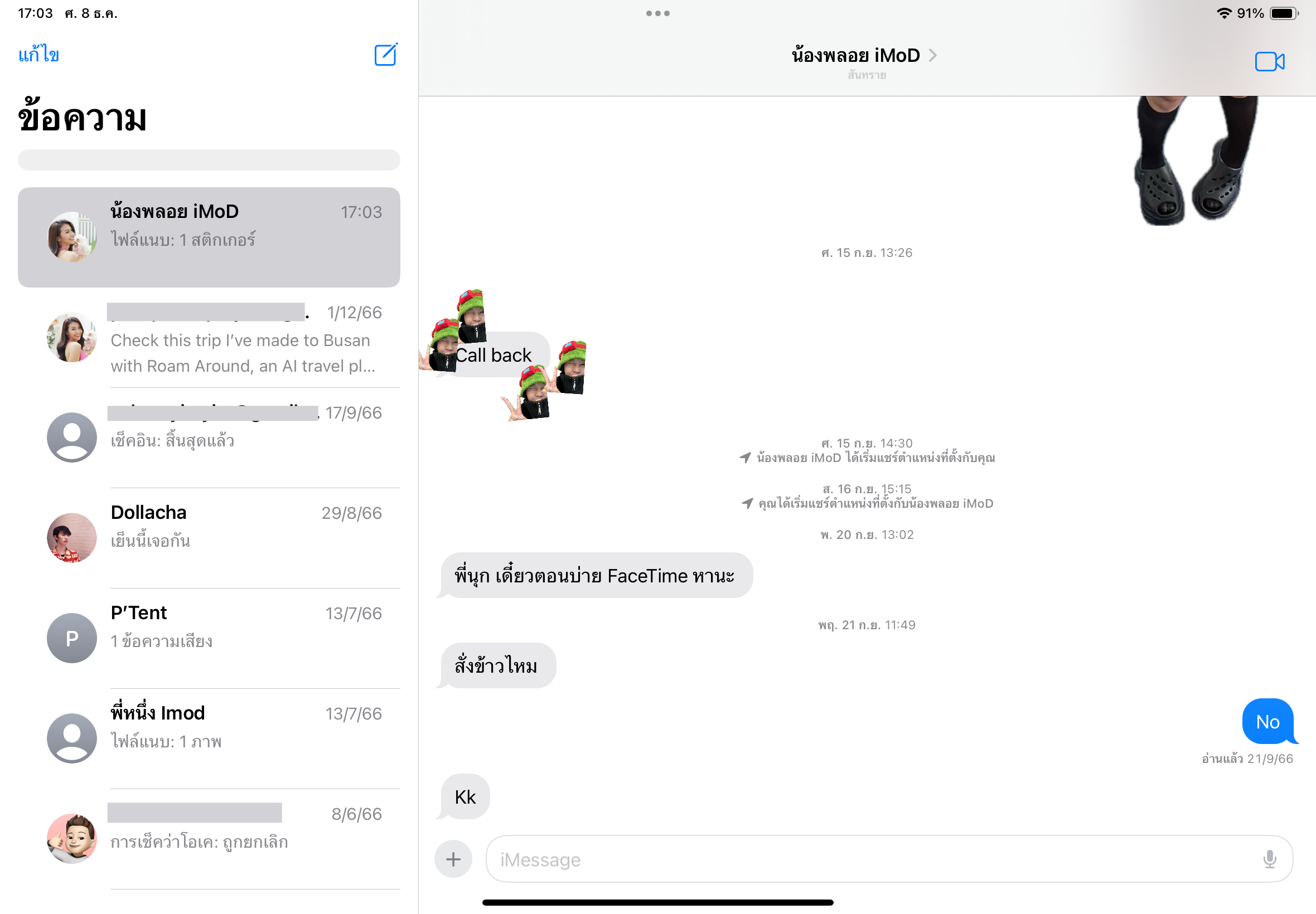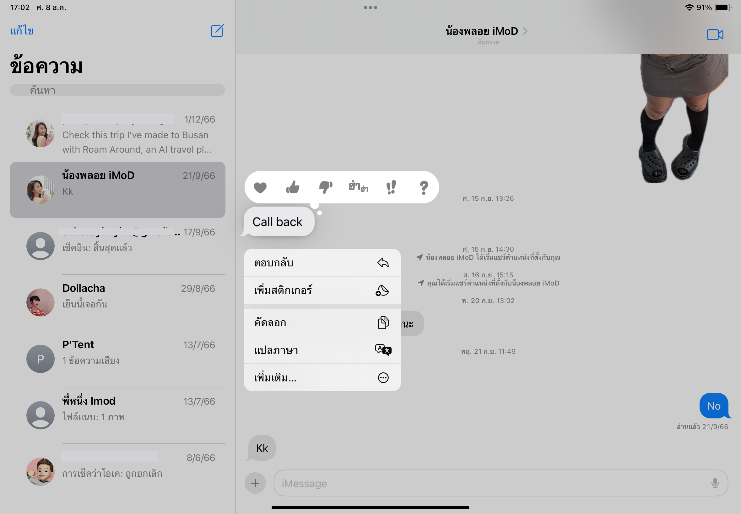 - เพิ่มสติ๊กเกอร์ : สามารถเพิ่มสติ๊กเกอร์เพื่อรีแอคชั่นข้อความได้ เพียงแค่แตะค้างไว้ที่ข้อความ > แตะ “เพิ่มสติ๊กเกอร์” > เลือกสติ๊กเกอร์ที่ชอบ แล้วกดรีแอคชั่นข้อความของเพื่อนได้เลย