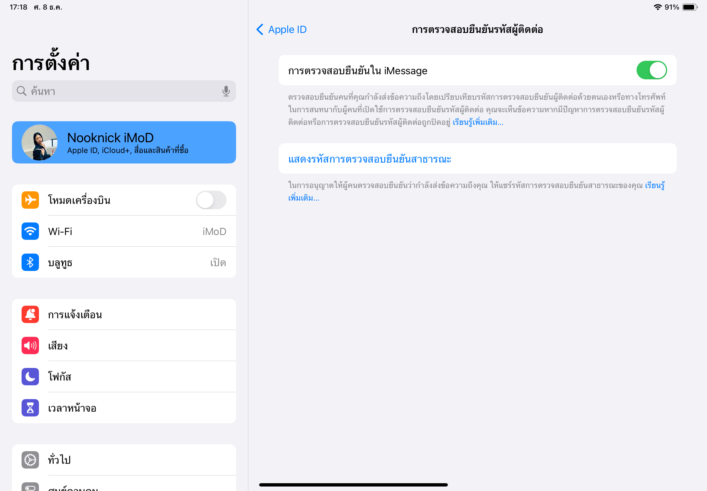- การตรวจสอบยืนยันใน iMessage : เมื่อเปิดใช้งานฟีเเจอร์นี้แล้ว จะมีการแจ้งเตือนอัตโนมัติพร้อมรหัสยืนยันการติดต่อ เพื่อเพิ่มความปลอดภัยในการสื่อสารและทำให้แน่ใจว่าคนที่สนทนาอยู่มีตัวตนจริง ๆ และกำลังสนทนาภายใต้ฟีเจอร์ที่มีการปกป้องขั้นสูงอีกด้วยไปที่การตั้งค่า > เลือก Apple ID > เลือก “การตรวจสอบยืนยันรหัสผู้ติดต่อ” > เลื่อนเปิด “การตรวจสอบยืนยันรหัสผู้ติดต่อ”