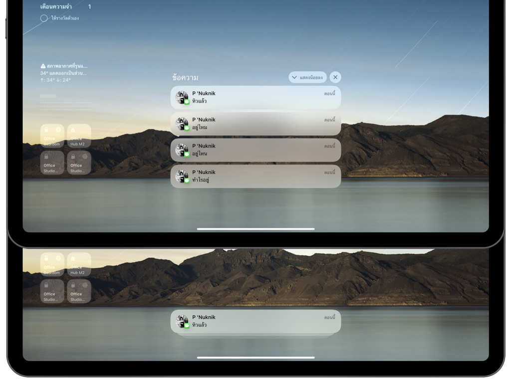 สำหรับการเชื่อมต่อ iPad กับหน้าจอเสริม เวลาที่ปัดหน้าจอล็อคลงมาเพื่อดูเวลา หรือดูการแจ้งเตือน ตัวหน้าจอเสริมที่เชื่อมต่ออยู่จะยังไม่ดับลง