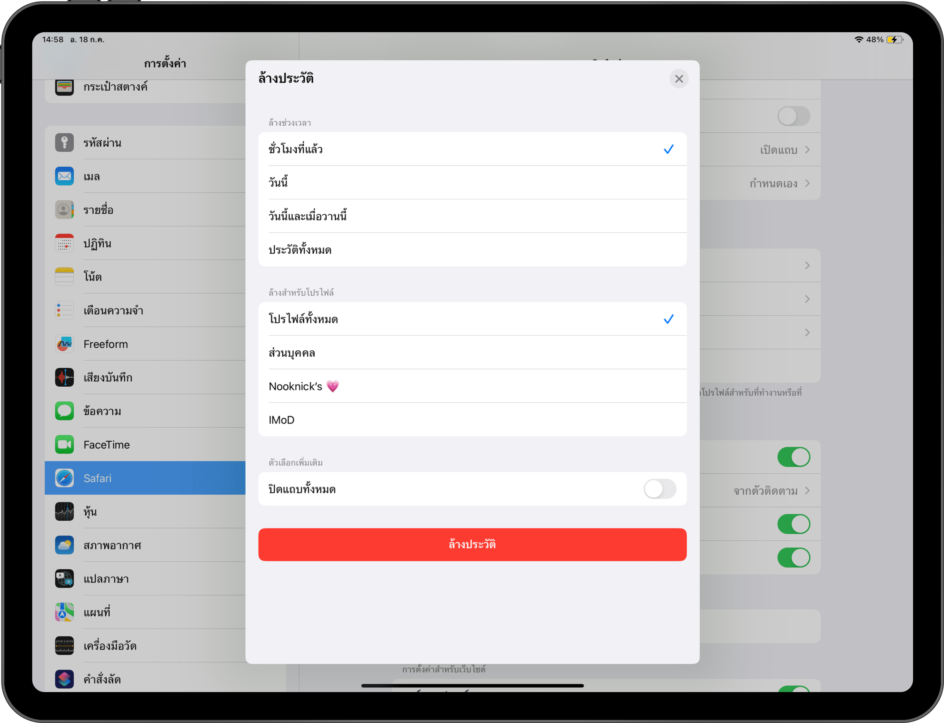 iPadOS 17 สามารถเลือกการล้างประวัติการเข้าชมเว็บไซต์ได้ Safari ได้ ซึ่งสามารถเลือกได้ว่าจะล้างประวัติแบบไหน เช่น เมื่อชั่วโมงที่แล้ว, วันนี้, วันนี้และเมื่อวาน หรือล้างทั้งหมด รวมไปถึงการลบโปรไฟล์ Safari ก็สามารถทำได้ในขั้นตอนนี้เลย