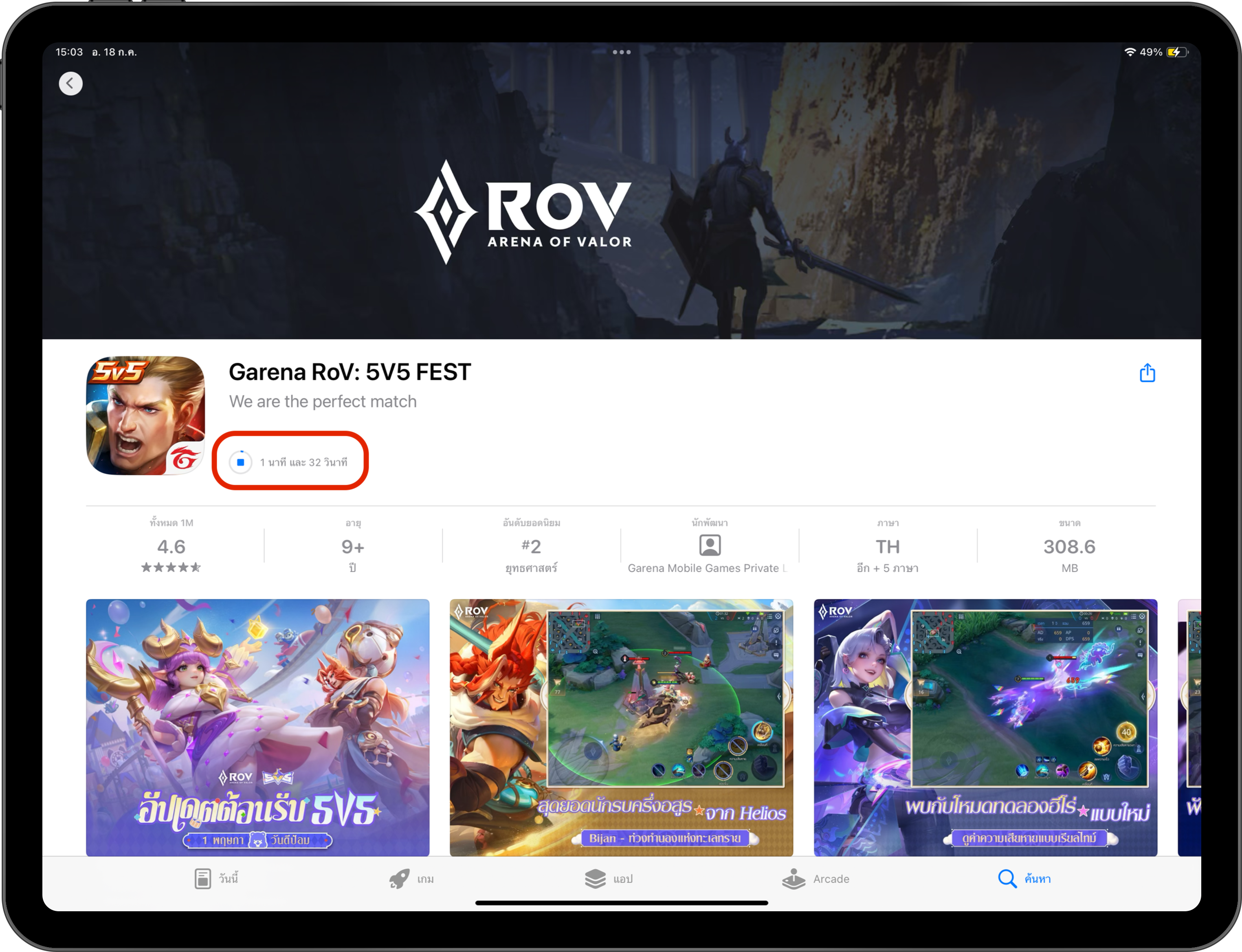เมื่อกดดาวน์โหลดแอปที่เป็นไฟล์ขนาดใหญ่ใน App Store จะมีระยะเวลาการดาวน์โหลดของแอปนั้นแสดงขึ้นมา ช่วยให้เราสามารถวางแผนการทำงานอย่างอื่นต่อไปได้