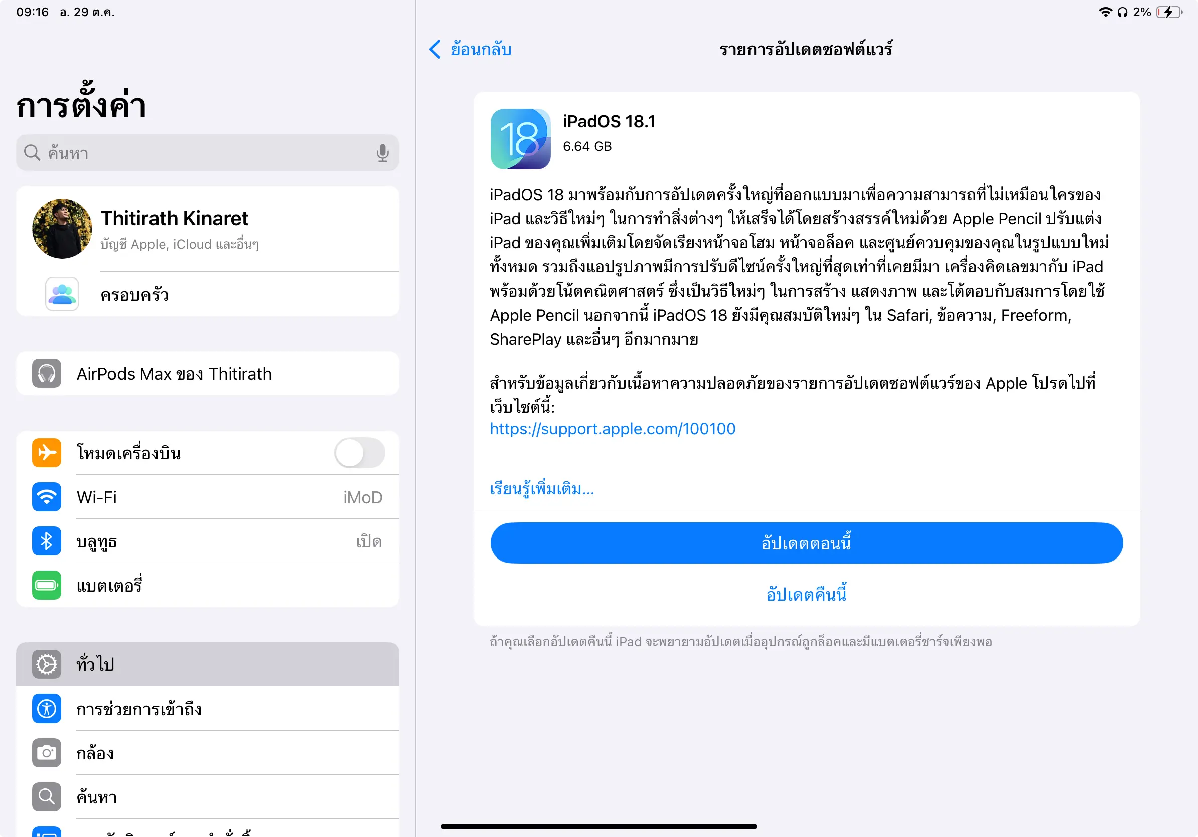 ผู้ใช้ iPad รุ่นรองรับสามารถอัปเดตเป็น iPadOS 18.1 ได้เลยที่ การตั้งค่า > ทั่วไป > รายการอัปเดตซอฟต์แวร์