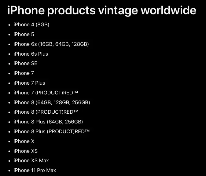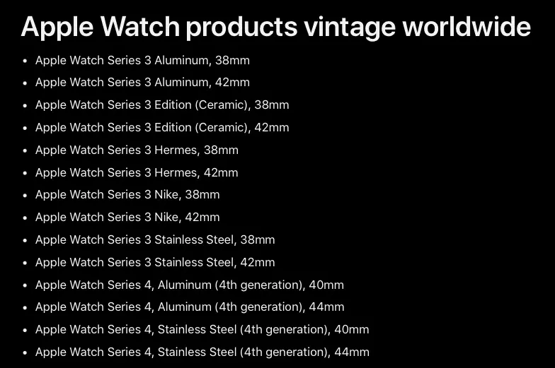 Apple ได้เพิ่มรายชื่อ iPhone 11 Pro Max และ Apple Watch Series 3 เป็นผลิตภัณฑ์ Vintage ผลิตภัณฑ์ที่ Apple หยุดการจัดจำหน่าย 5 ปี แต่ไม่เกิน 7 ปี ซ่อมได้หากอะไหล่เหลือ